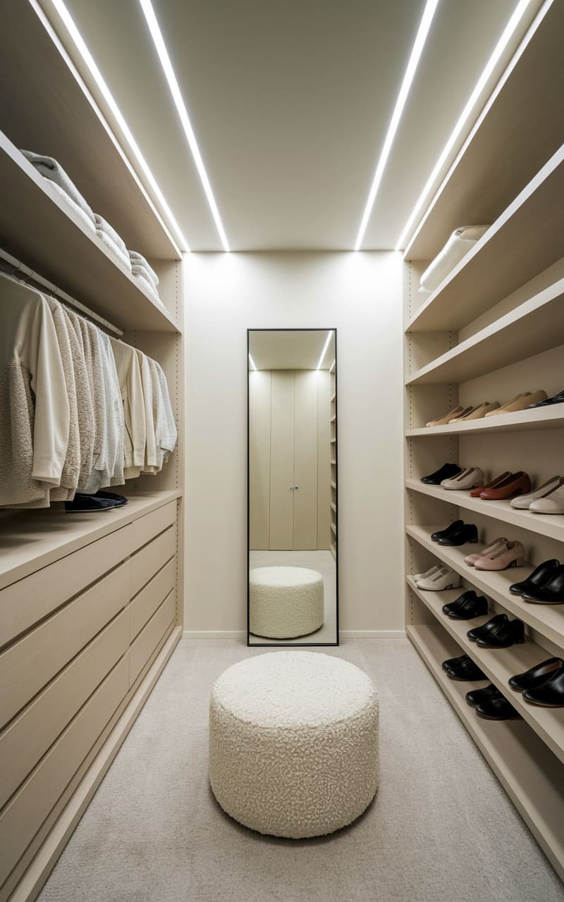 A hushed elegance permeates this narrow dressing room, where soft, ambient light spills from sleek, recessed strips, illuminating rows of neatly arranged clothing and shoes. The space whispers of curated simplicity, with a plush, round ottoman anchoring the center like a fluffy cloud. A tall, slender mirror reflects the serene order, amplifying the room’s gentle glow and creating an illusion of depth in the compact, personal sanctuary.