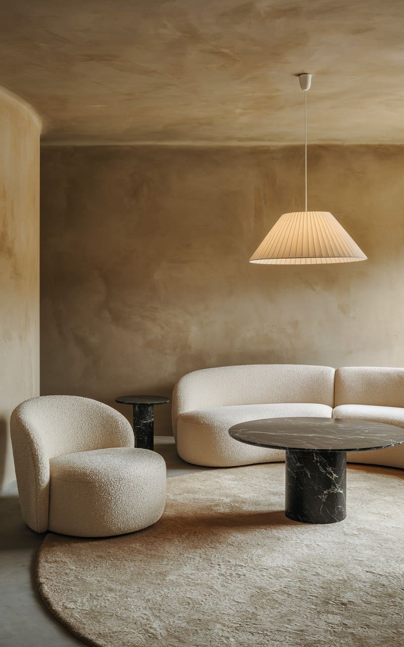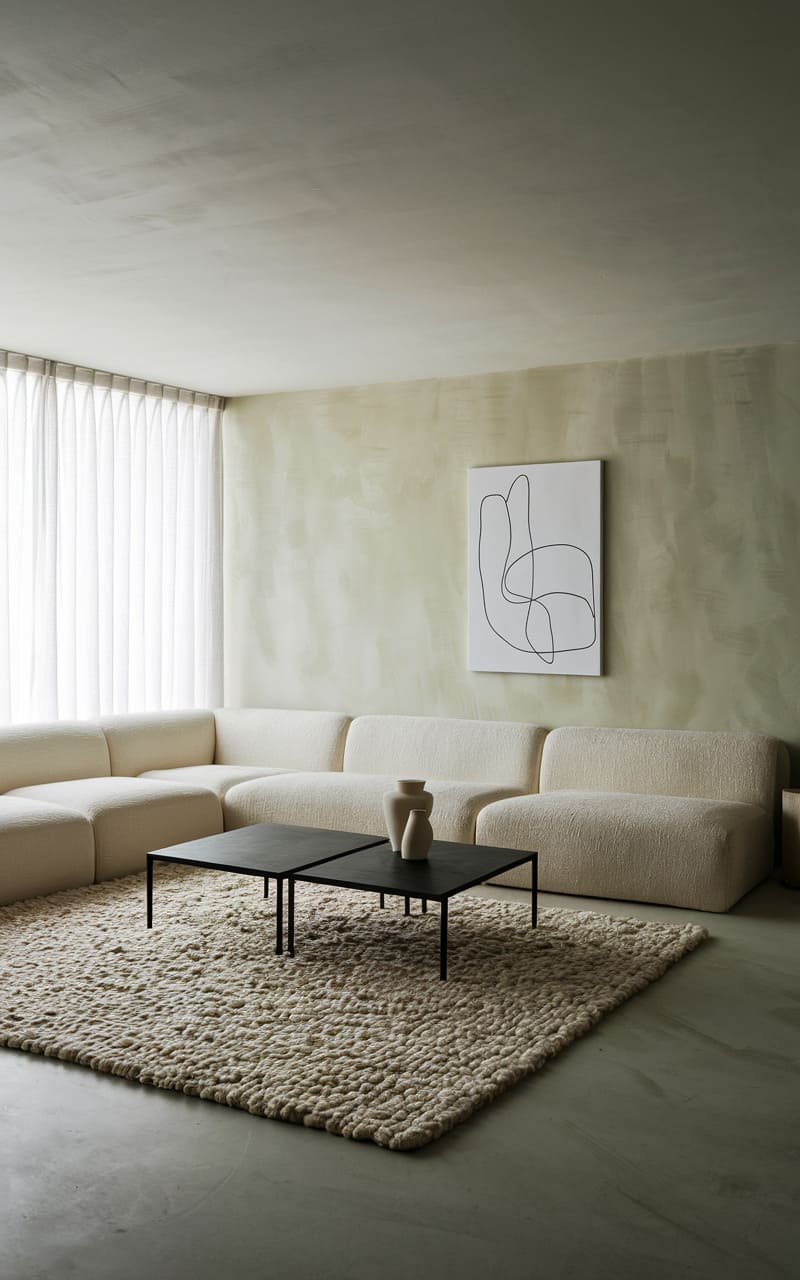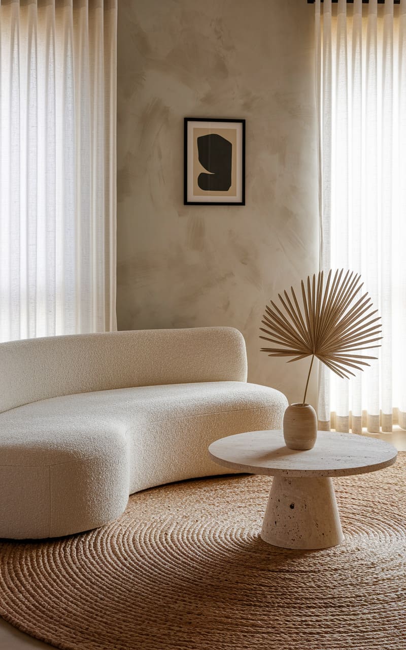 A whisper of cream, this room breathes serenity. A plush, serpentine sofa in a textured, off-white fabric anchors the space, its gentle curve echoing the concentric circles of a woven rug beneath a stone-like coffee table. A single, abstract artwork hangs against a subtly mottled wall, while sheer, flowing curtains frame the soft glow entering from unseen windows, casting a tranquil, almost ethereal light upon a solitary, dried palm frond in a simple vase.