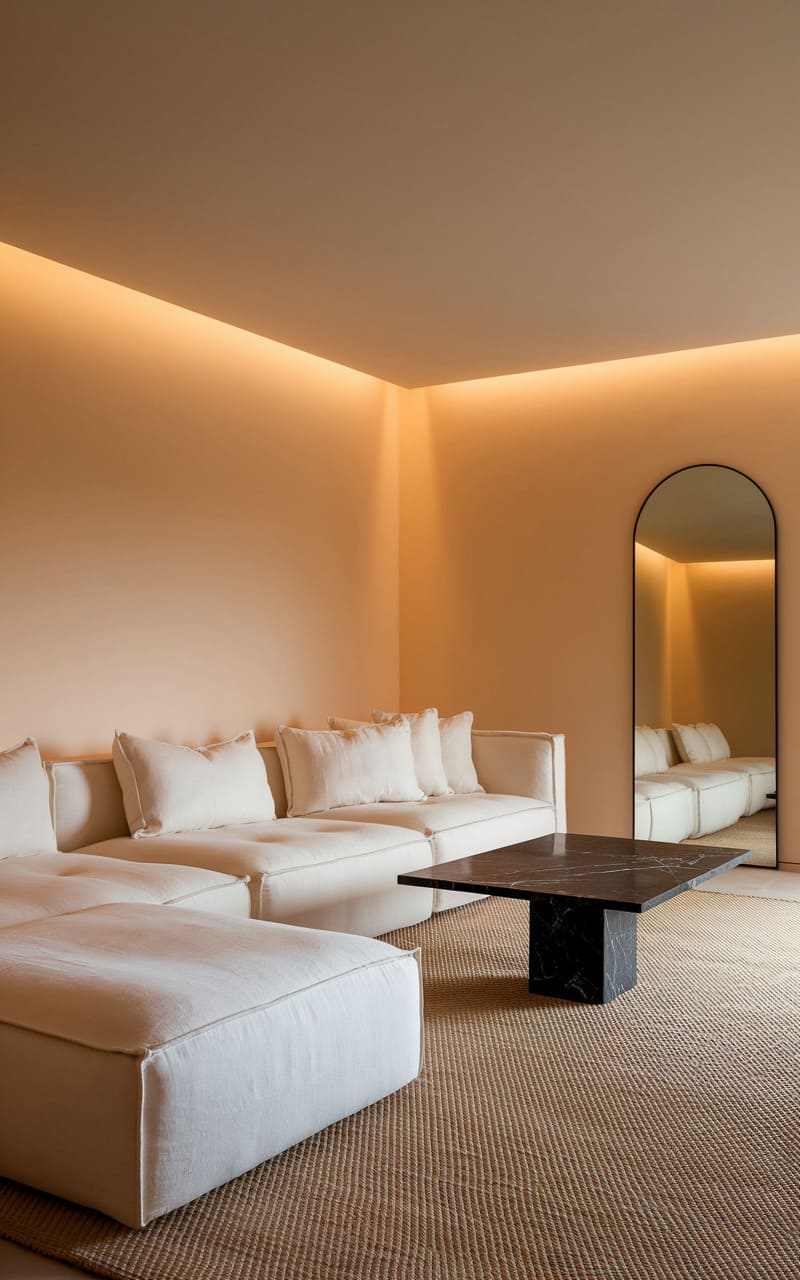 The room whispers serenity. A soft, peachy glow emanates from hidden fixtures, illuminating the clean lines of a plush, modular sofa in creamy white. A dark, marbled coffee table anchors the space, its sleek surface reflecting the subtle illumination. An arched mirror, leaning casually against the wall, doubles the illusion of spaciousness, hinting at a world beyond the frame. A textured rug, woven with earthy tones, grounds the composition, adding a touch of rustic warmth to the otherwise ethereal ambiance.