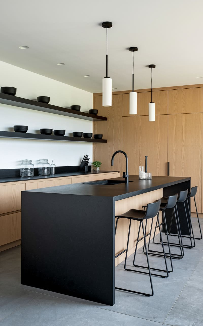 A trio of pendant lights, like inverted ice cream cones, descend over a stark, black kitchen island, their cool glow highlighting the sleek, uninterrupted surface. Behind, warm wood cabinetry stretches across the wall, a quiet counterpoint to the island’s drama. A single, dark shelf floats above, punctuated by a regiment of bowls, each a dark echo of the island’s bold statement. The room feels intentional, a study in contrasts where light and shadow play across clean lines and quiet textures.