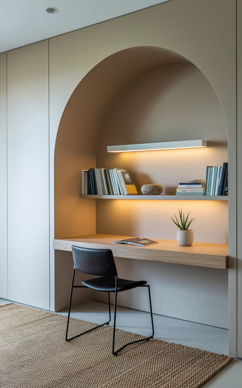 Nestled within a muted palette of soft neutrals, a serene workspace emerges from the wall like a carved niche, its arched alcove framing a simple desk and illuminated shelves. The subtle glow from hidden lighting highlights the textures of the books and the smooth wood, while a single, grounded chair invites contemplation in this haven of quiet focus.