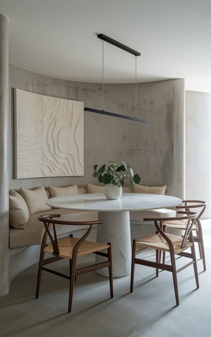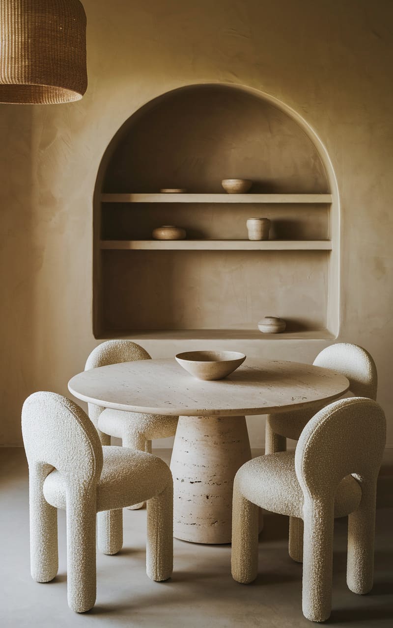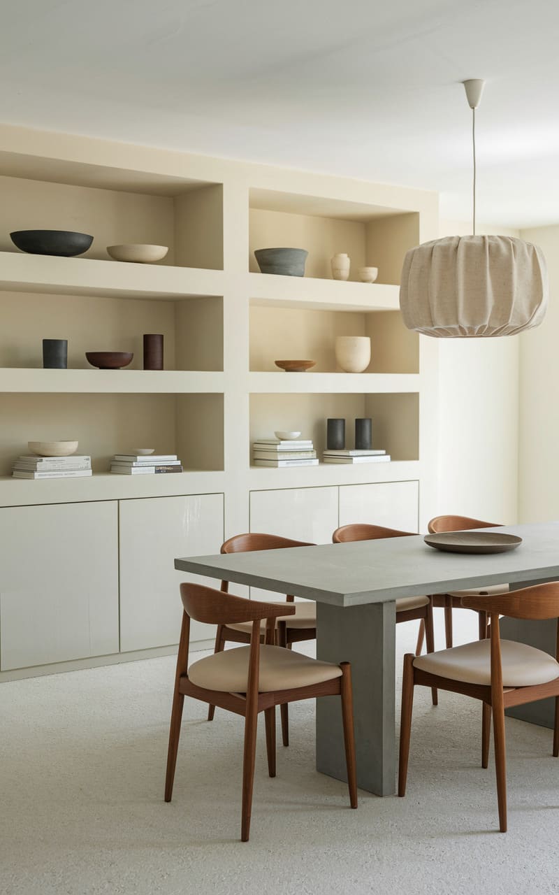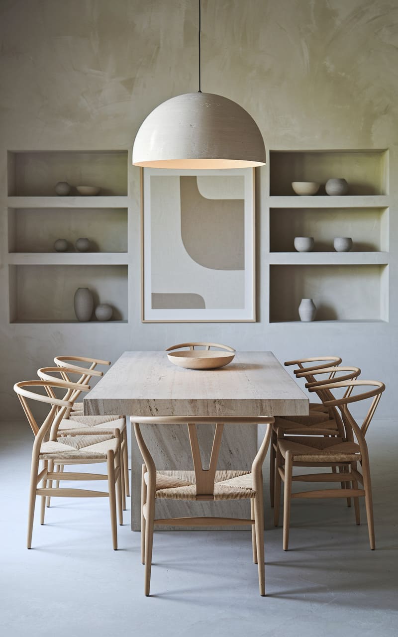 A hushed, almost monastic space unfolds, where the raw texture of plaster embraces a simple, unadorned table. Six woven chairs, like delicate skeletal forms, gather around, their pale wood mirroring the stone beneath. A paper moon of a pendant lamp hovers overhead, casting a soft, diffused glow that barely disturbs the quiet geometry of the recessed shelves and the framed abstract print, a silent conversation in neutrals.