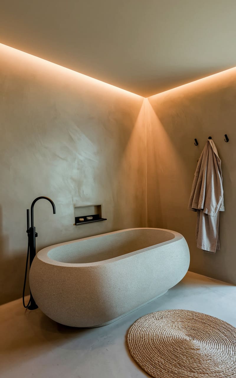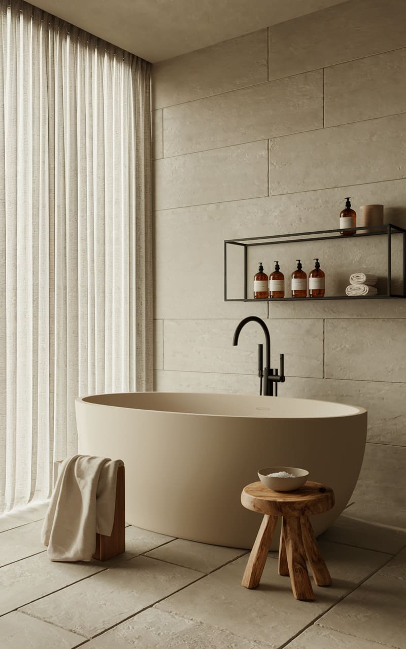A hushed serenity fills the space, where a sculpted, pebble-toned tub anchors the room like a smooth, ancient artifact. Light, filtered through sheer drapes, softly illuminates the textured walls and simple, dark shelving holding amber bottles. A rustic wooden stool and a folded towel add a touch of warmth and the suggestion of ritual to this otherwise austere, contemplative retreat.