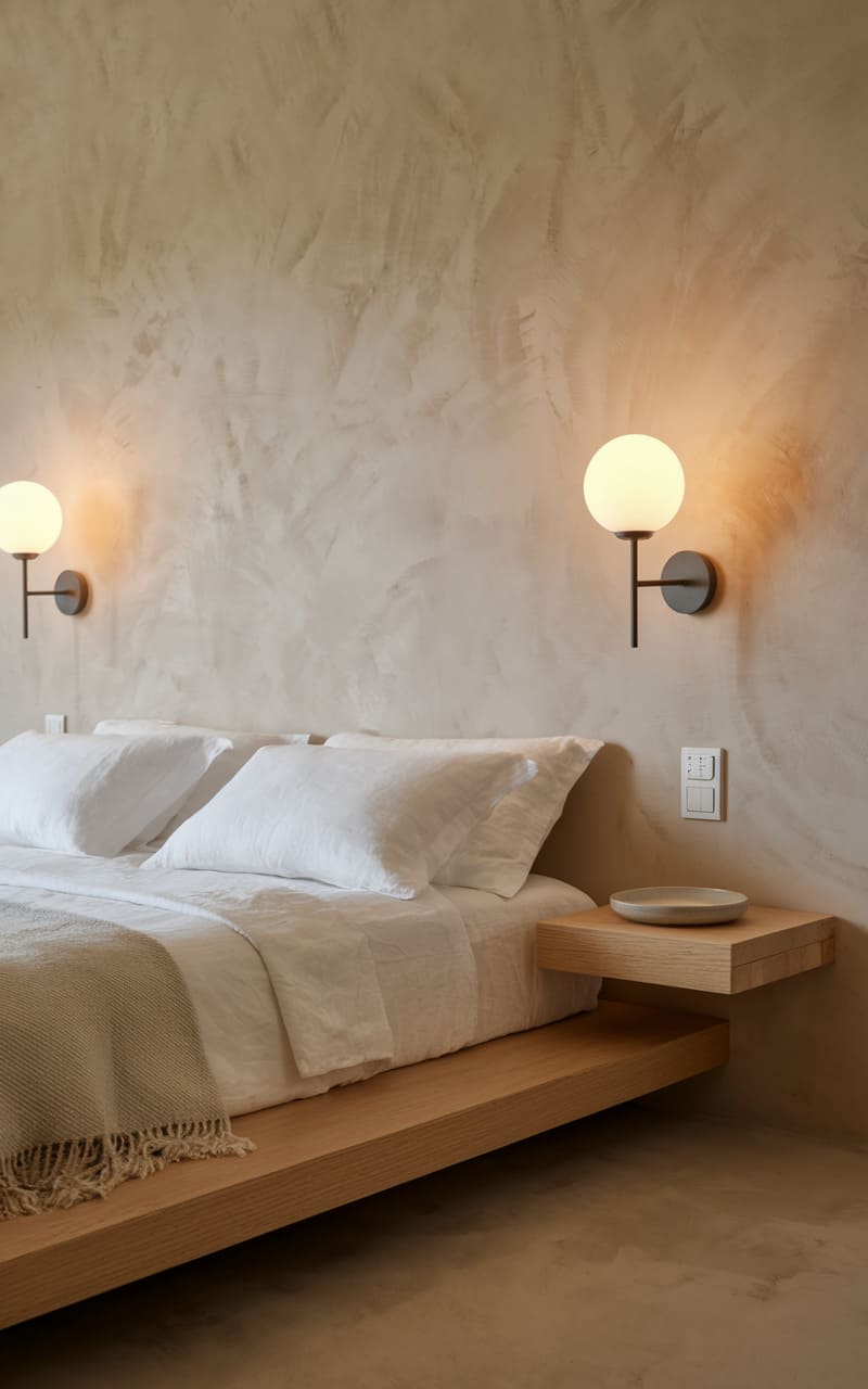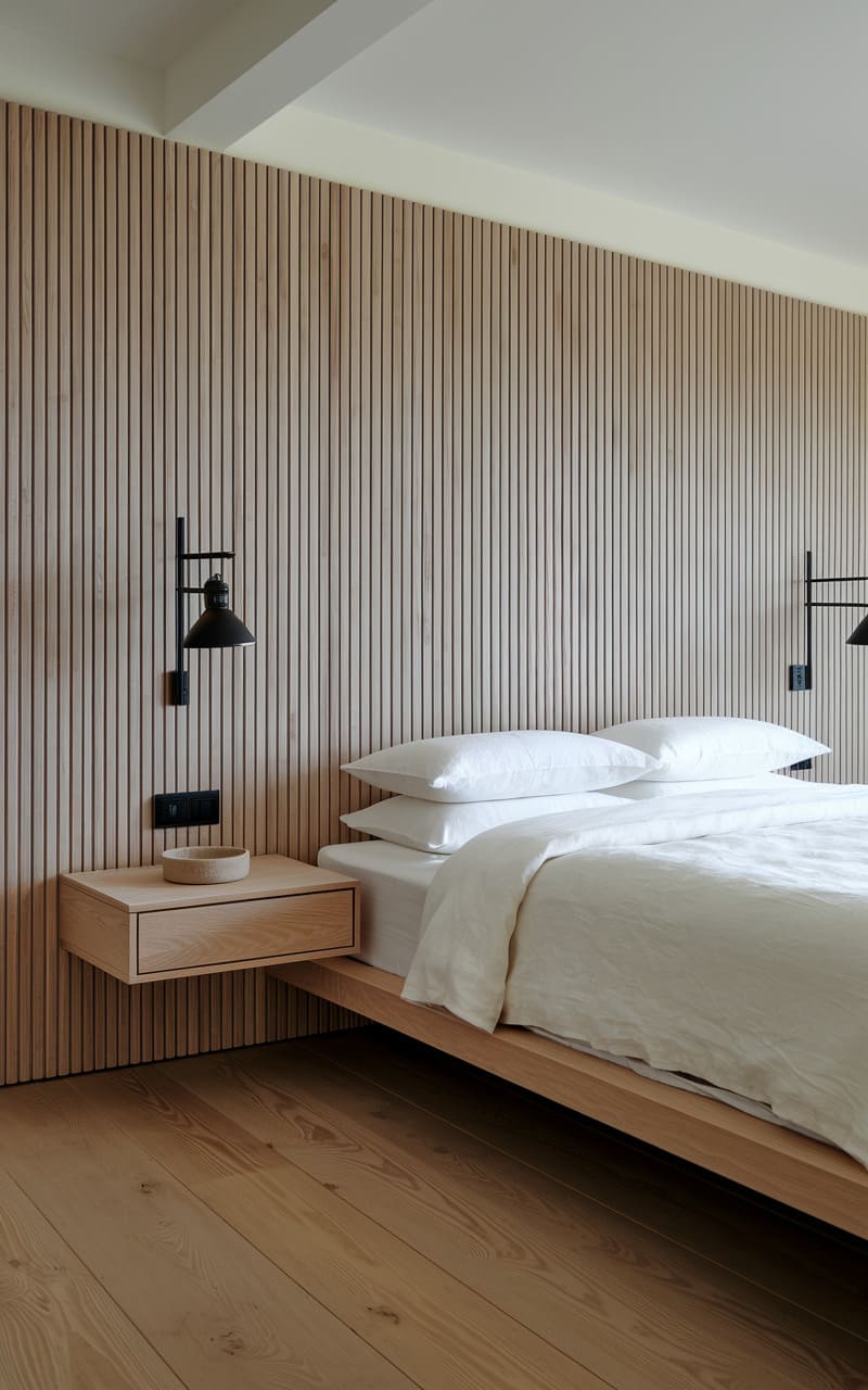 A serene simplicity pervades this space, where the warmth of blonde wood floors meets a textured panel wall, creating a quiet backdrop. The low-slung platform bed, dressed in crisp white linens, anchors the room with a sense of grounded tranquility. Two minimalist sconces, perched like watchful sentinels, cast a soft glow, highlighting the clean lines and unadorned elegance of the floating bedside table.