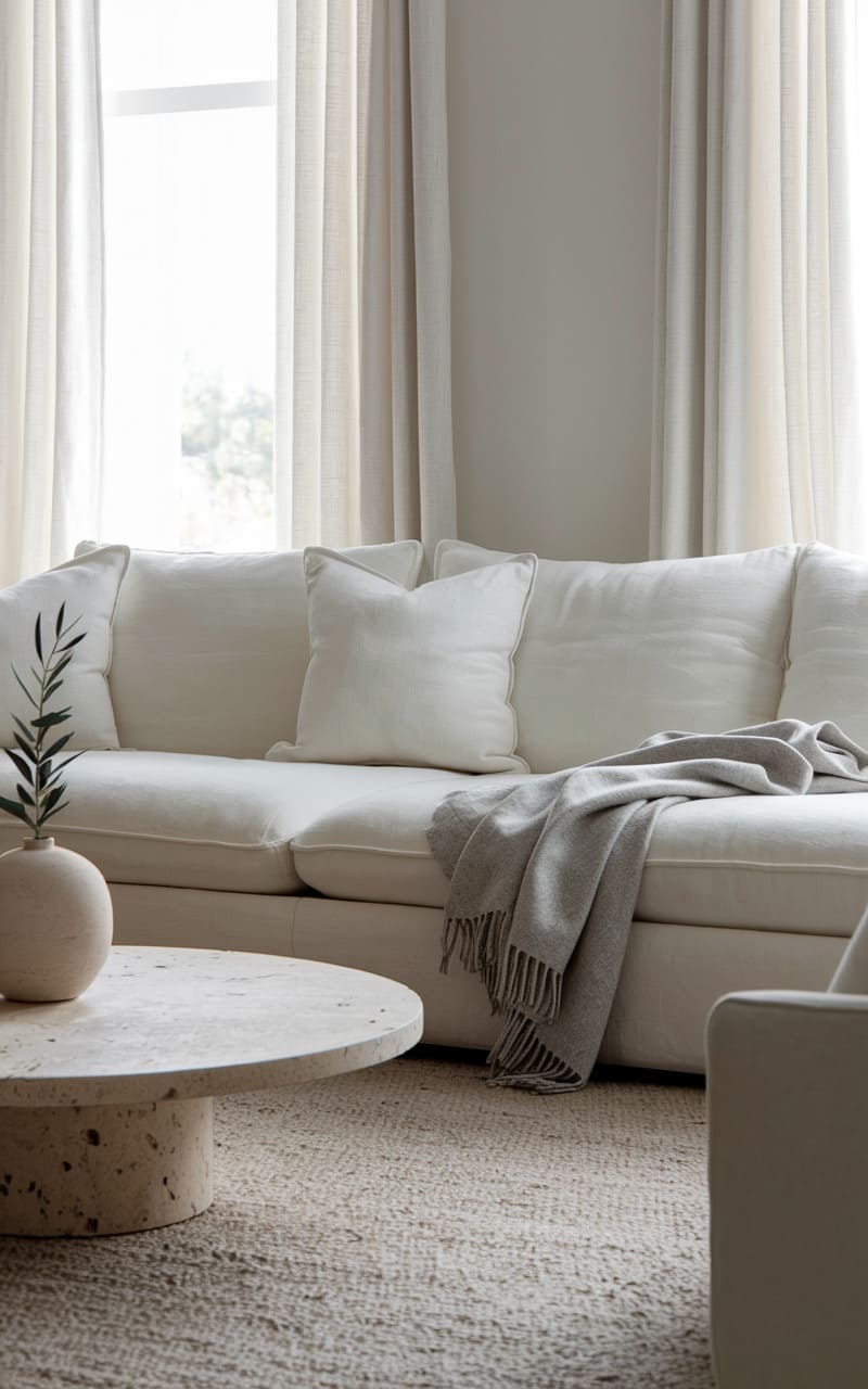 21. Minimalist Living Room with Soft Linen Upholstery