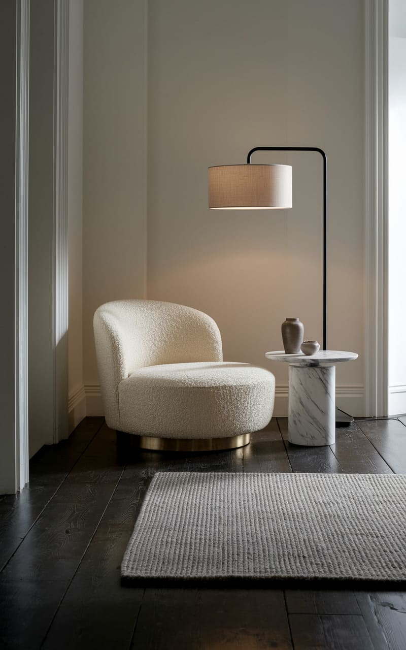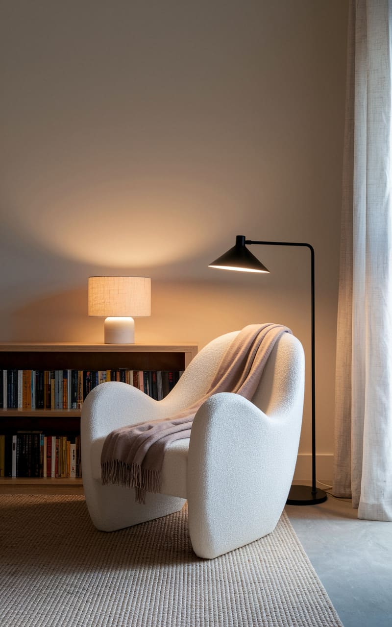 24. Minimalist Reading Nook with a Bouclé Lounge Chair