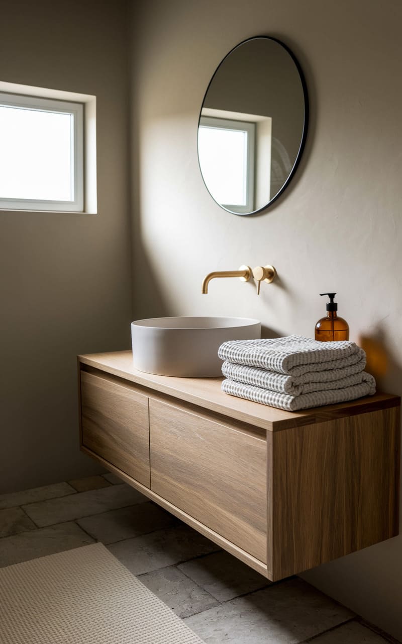 A whisper of light spills into the muted space, highlighting the smooth, round washbasin nestled atop a sleek, wooden vanity. The room exudes a quiet elegance, with its simple, circular mirror and a stack of neatly folded towels hinting at understated luxury. The warm, earthy tones of the walls and floor create a serene backdrop, a sanctuary carved from the everyday.