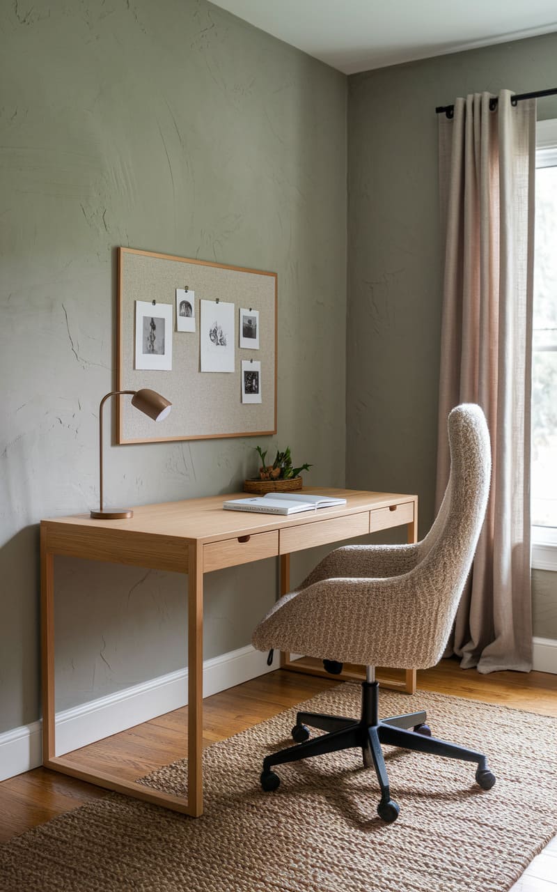 A quiet corner hums with purpose, a clean wooden desk poised for creation beneath a textured, muted green wall. Pinned memories linger on a fabric board, while a soft, sculptural chair invites contemplation. Light spills generously from a nearby window, illuminating a woven rug that grounds the space, a haven of calm and understated style.