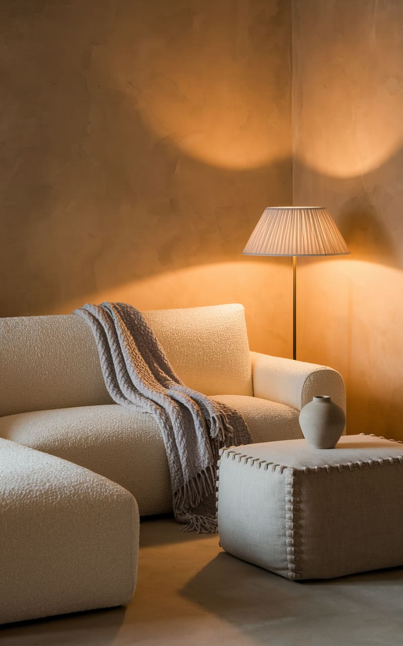 A whisper of warmth spills from a pleated lampshade, casting a soft, ochre glow across textured walls and plush, off-white seating. A chunky knit throw slouches casually over the sofa’s arm, its tassels hinting at a lived-in comfort. The simple, geometric ottoman anchors the space, its stitched seams a subtle counterpoint to the room’s otherwise smooth surfaces, while a solitary, rounded vase adds a touch of quiet sculpture to the scene. It’s an invitation to pause, a study in tranquility spun from light and shadow.