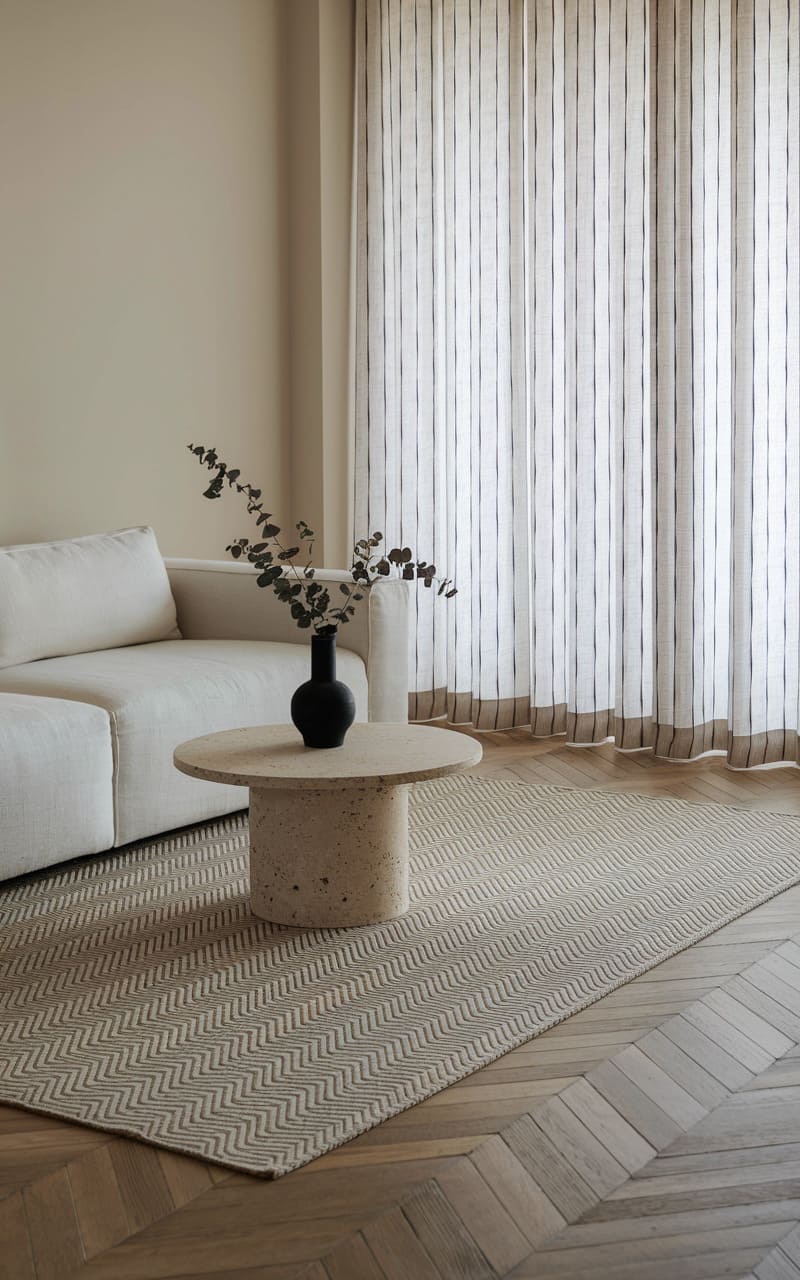 The room whispers serenity, a tableau of soft neutrals where a linen-textured rug stretches towards a plush, off-white couch, anchored by a unique, almost sculptural coffee table. Behind, sheer drapes with a delicate, vertical stripe pattern diffuse the room’s glow, creating a gentle, diffused ambiance that feels both airy and grounded. A simple sprig of greenery in a dark vase adds a touch of organic drama, the only stark contrast in this otherwise harmonious space.