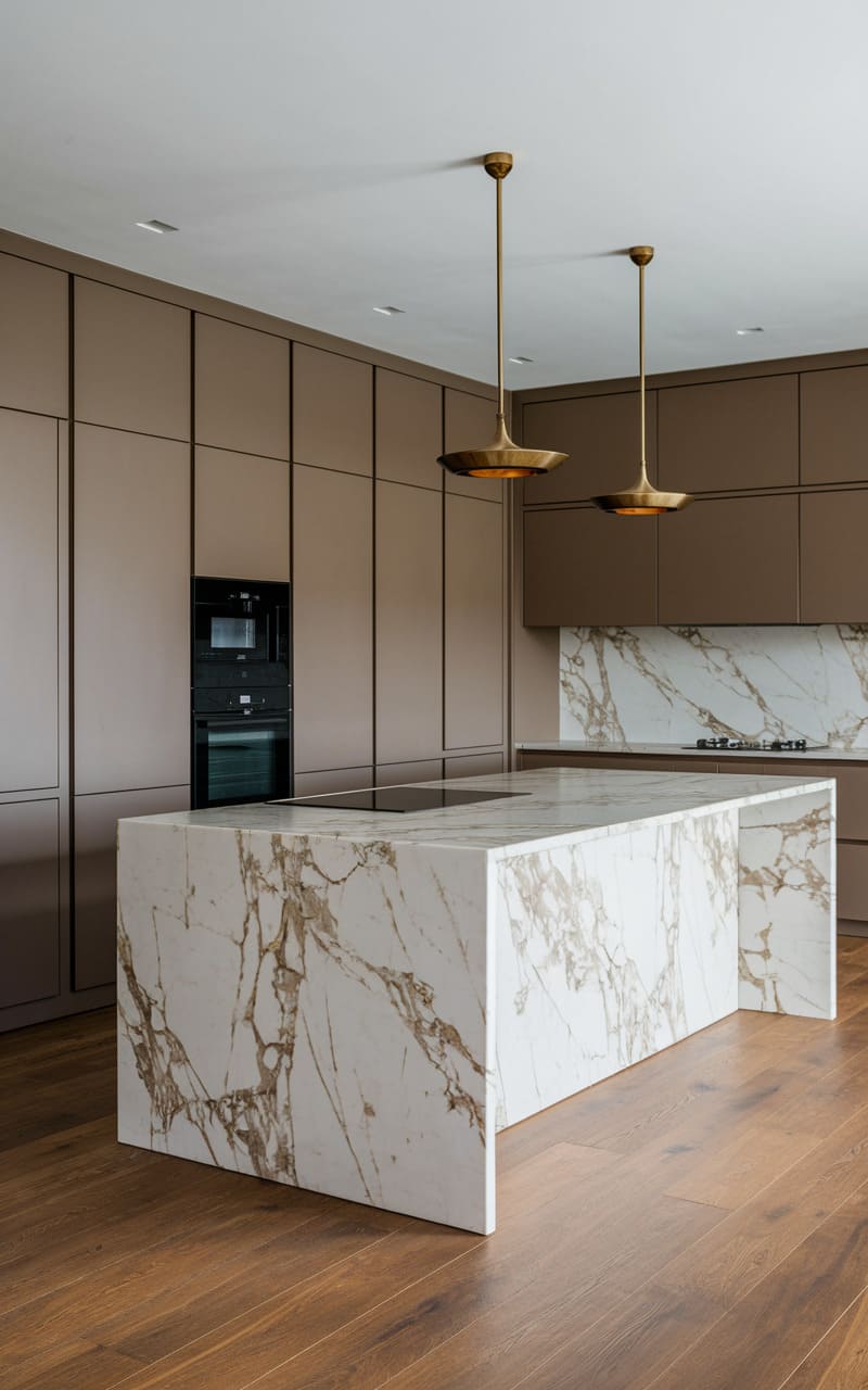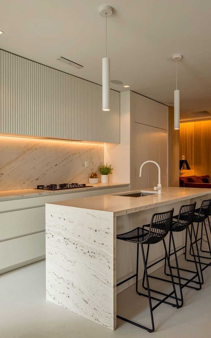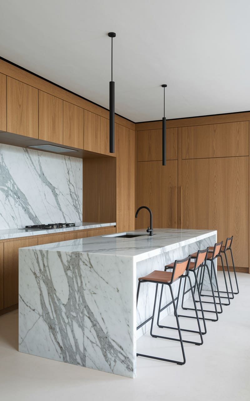 43. Minimalist Kitchen with a Marble Waterfall Island