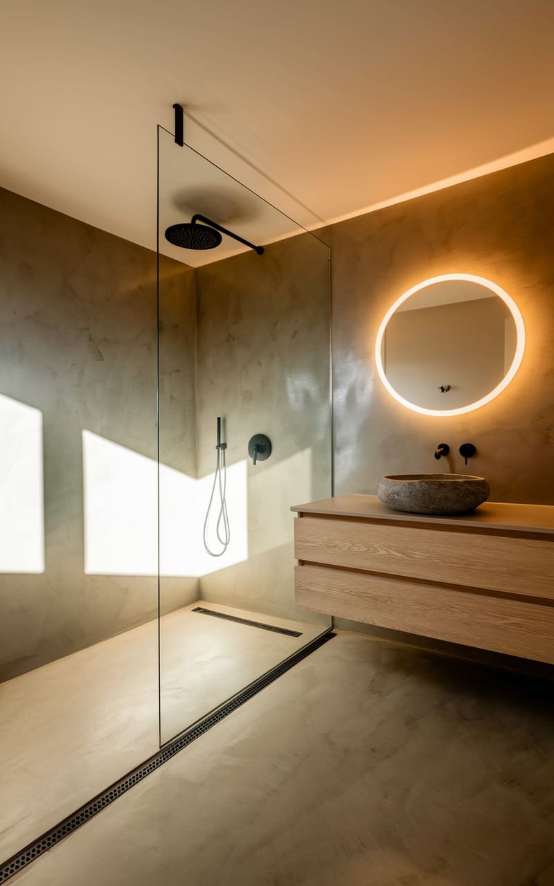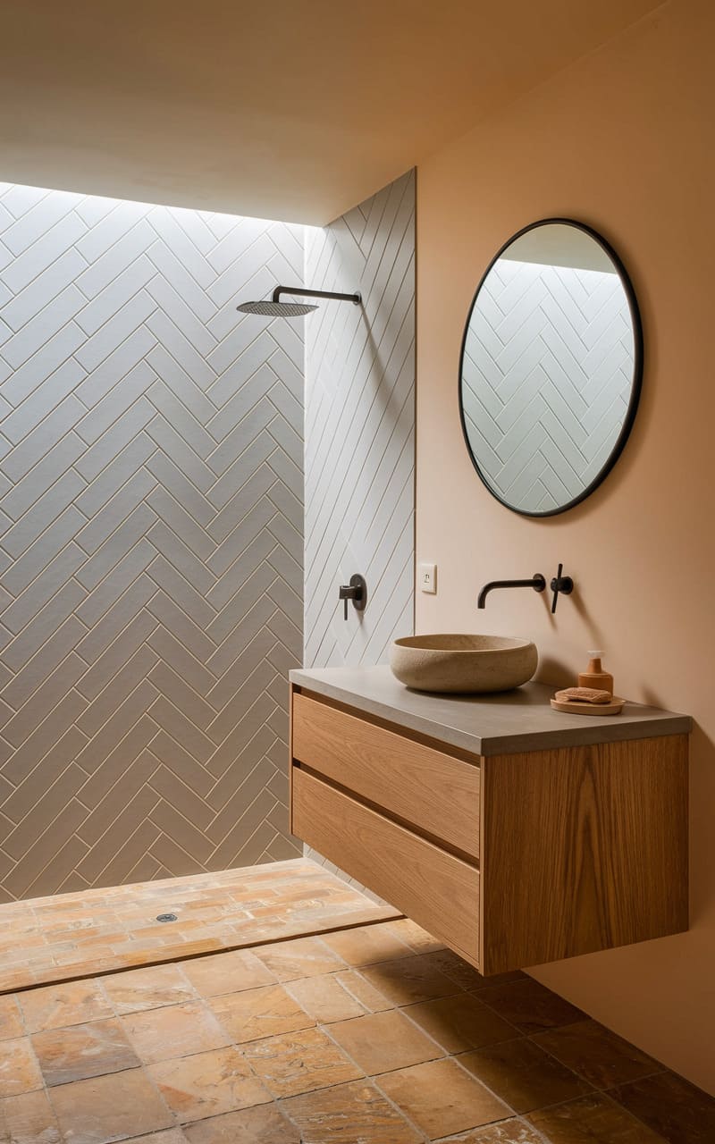 A wash of soft, reflected light illuminates this tranquil space, where the cool, herringbone-tiled shower meets the warm, earthy tones of the terracotta floor. A floating vanity, crafted from light wood and topped with a sleek stone surface, anchors the room, its simple lines echoed in the minimalist black fixtures and round mirror, creating a serene, almost monastic retreat.