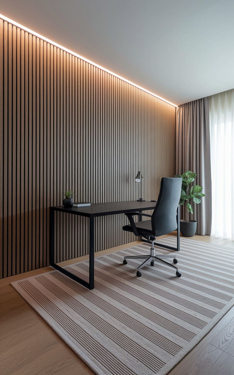 The quiet hum of focused work seems to emanate from this uncluttered space, where a sleek black desk and ergonomic chair stand ready against a backdrop of rhythmic wood paneling. The soft glow of hidden lighting casts a warm halo, accentuating the room’s serene geometry, while a striped rug anchors the scene, leading the eye towards the tranquil drape of sheer curtains and a potted plant, hinting at a connection to the outside world.