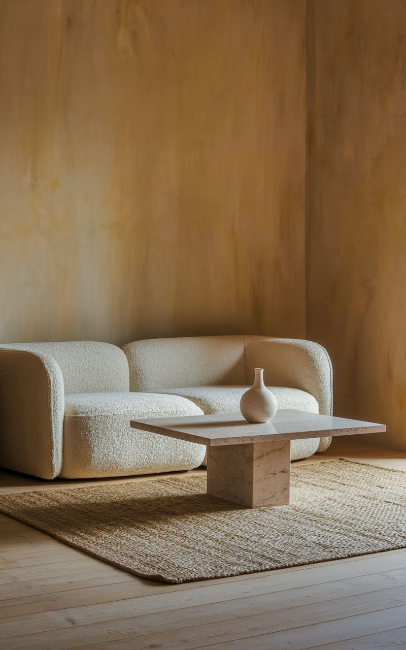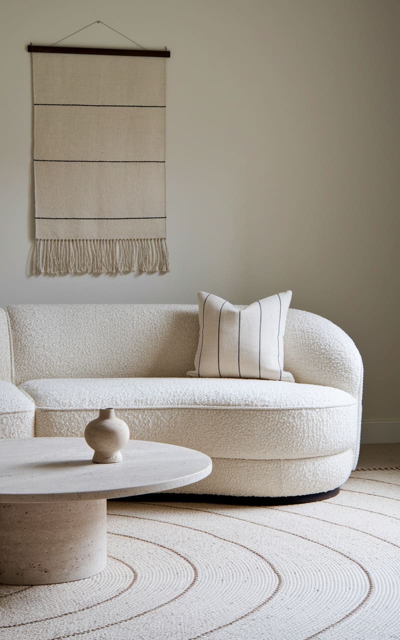 37. Minimalist Lounge with Textured Bouclé and Subtle Stripes