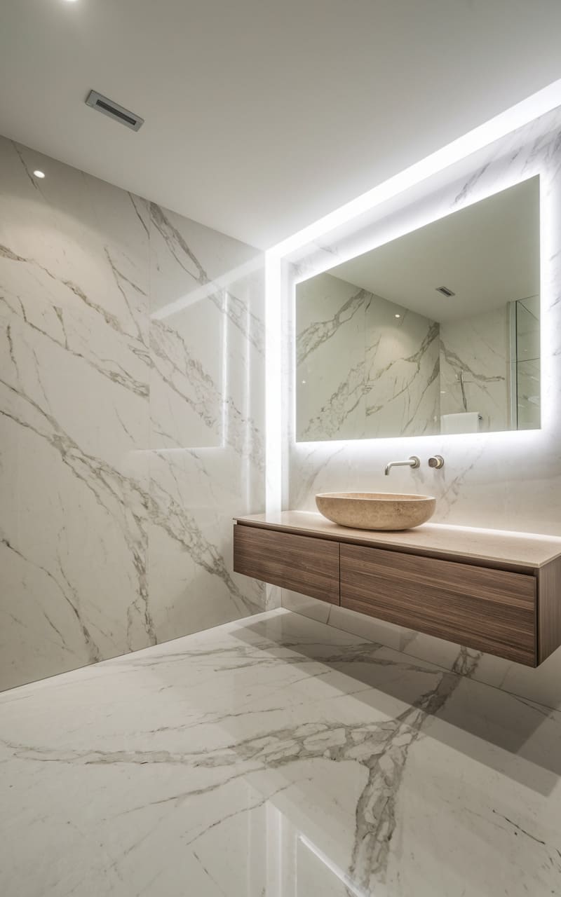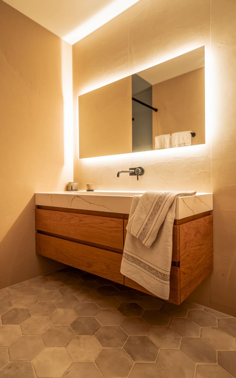The room hums with a quiet, modern elegance, its warmth emanating from the textured ochre walls that embrace a floating vanity of striated stone and rich wood. A glowing rectangle, the mirror, suspends in the space, casting a soft, diffuse illumination that catches the subtle sheen of the hexagonal floor tiles. It’s a sanctuary of clean lines and tactile surfaces, where a neatly folded towel hints at lived-in comfort rather than staged perfection.