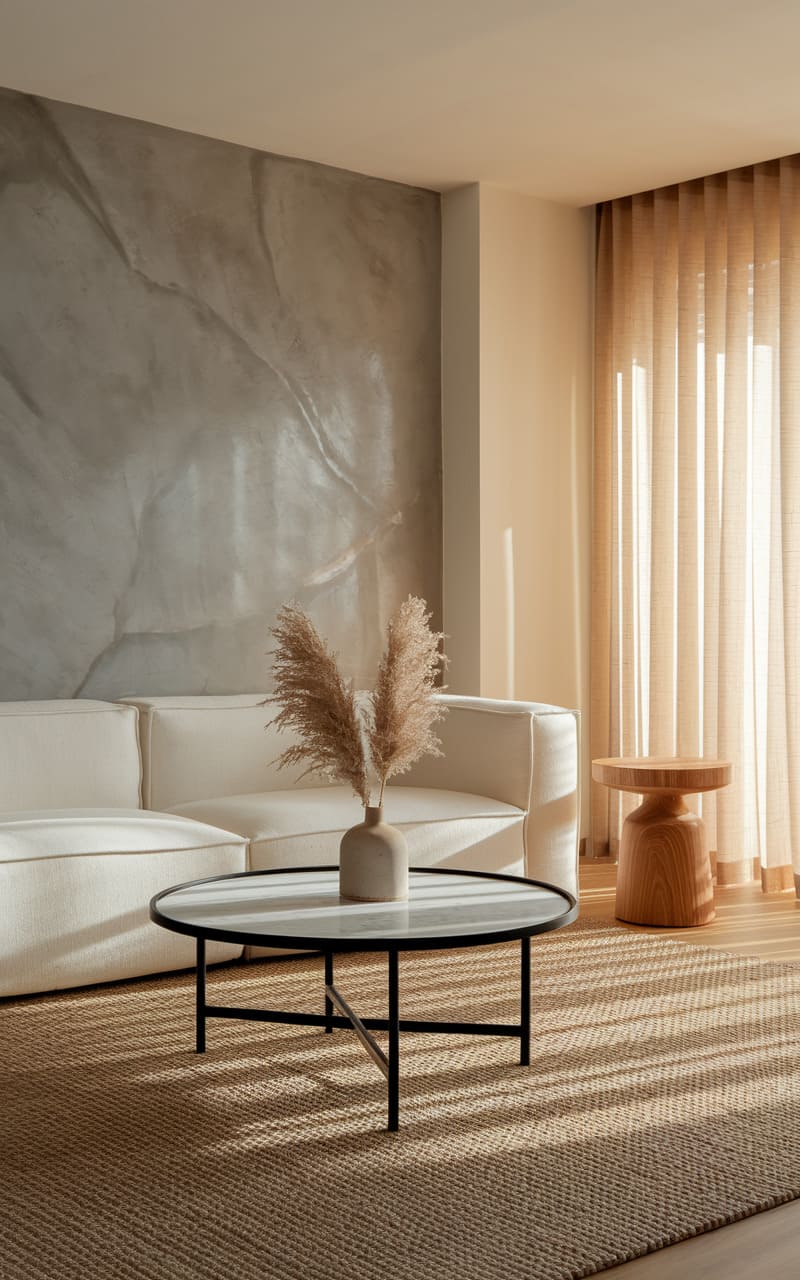 The room exhales tranquility. A plush, cream sofa anchors the space, its clean lines contrasting with the organic texture of the pampas grass centerpiece resting on a sleek, circular table. A monolithic wall, reminiscent of poured stone, stands stoically behind, while sheer, caramel drapes diffuse the day’s brightness, casting a warm glow on the woven rug and the sculptural wooden side table. The overall effect is one of serene simplicity, a carefully curated haven.