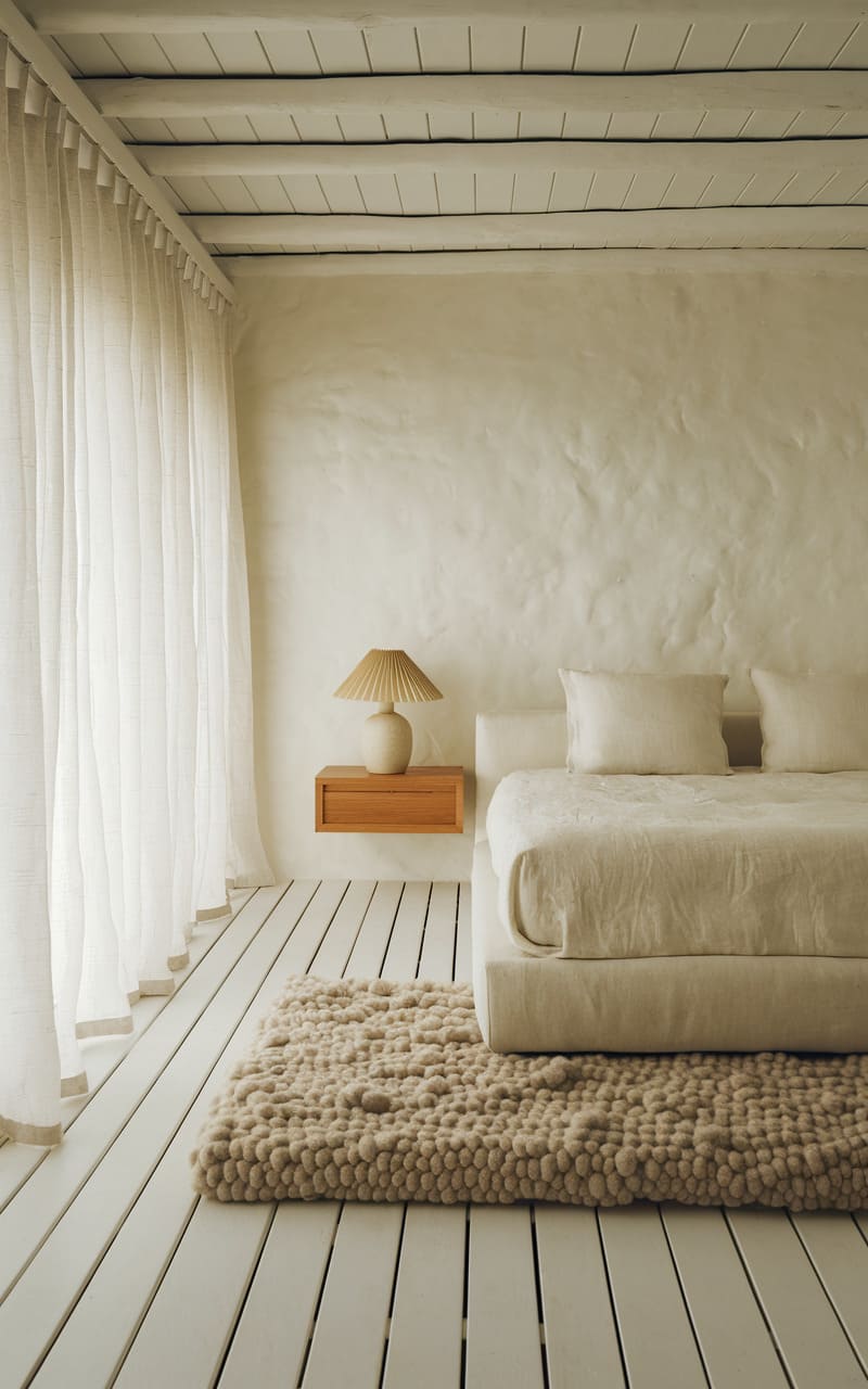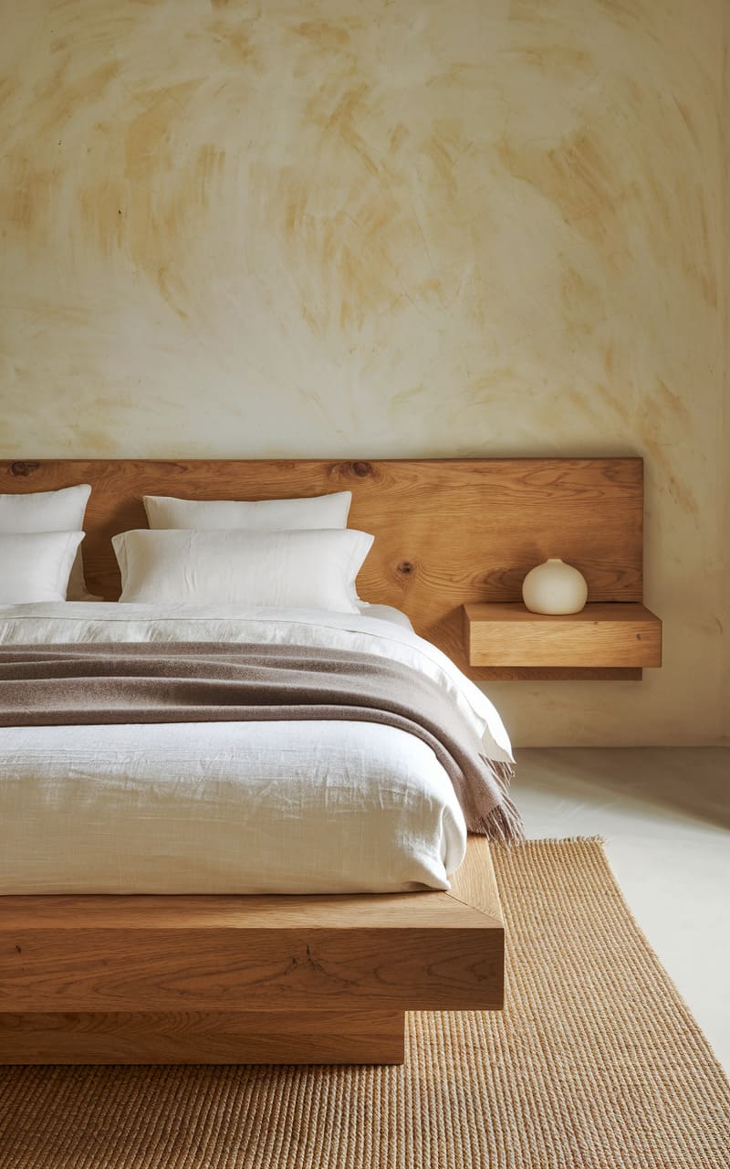 The room whispers tranquility, a haven where the rustic warmth of the wooden bed frame and floating nightstand harmonizes with the cool, textured wall. Crisp white linens invite repose, while a woven rug grounds the space, anchoring the eye to the simple elegance of the design. A single, spherical vase on the nightstand echoes the gentle curves of the bedding, adding a touch of quiet artistry to the serene tableau.