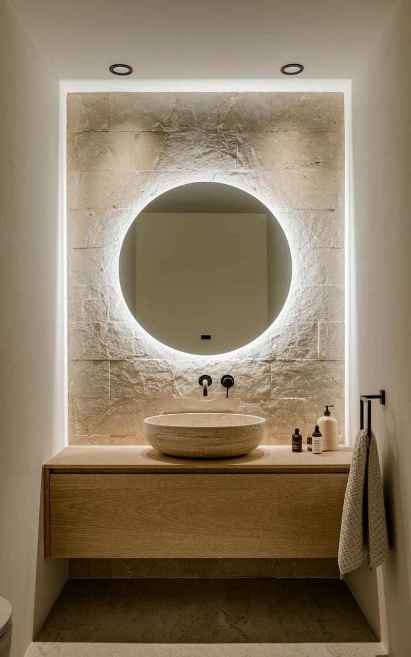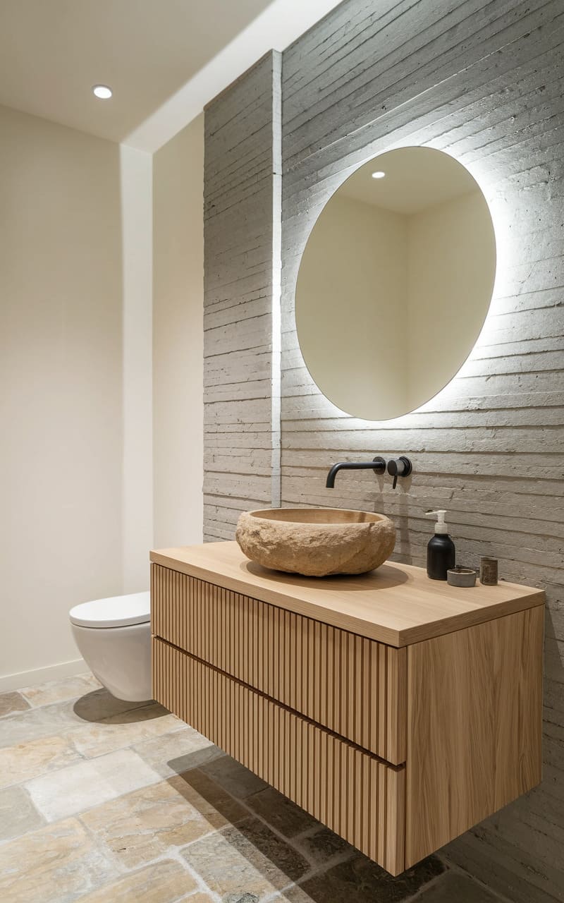This space whispers of raw elegance, where the rough texture of concrete meets the smooth, warm grain of a floating vanity. A sculpted stone basin, like a relic unearthed, centers the composition beneath a haloed, circular mirror, all while a stark, white toilet stands sentinel in the corner, a silent observer in this tableau of refined simplicity.