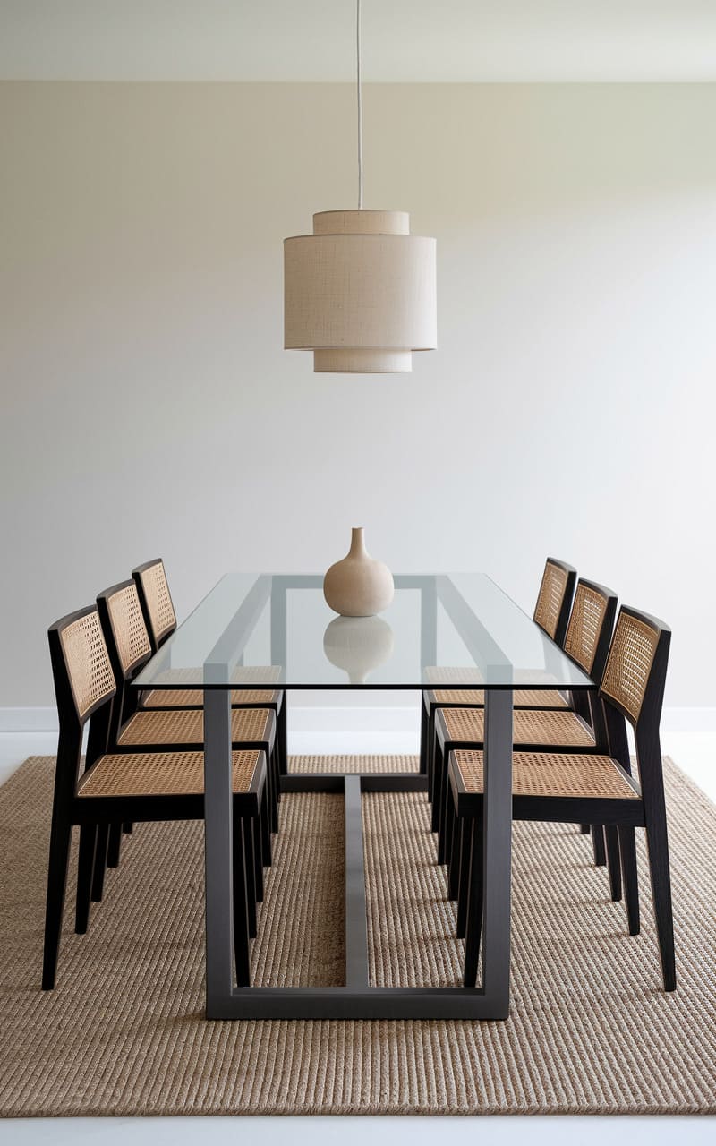 Pale warmth suffuses this serene space, where a glass-topped table floats above a geometric base, anchored by six slender chairs with woven backs. A simple, tiered pendant casts a gentle glow, highlighting the lone, rounded vase at the table’s center. The room whispers tranquility, a study in clean lines and quiet elegance, all resting upon a textured rug that invites bare feet.