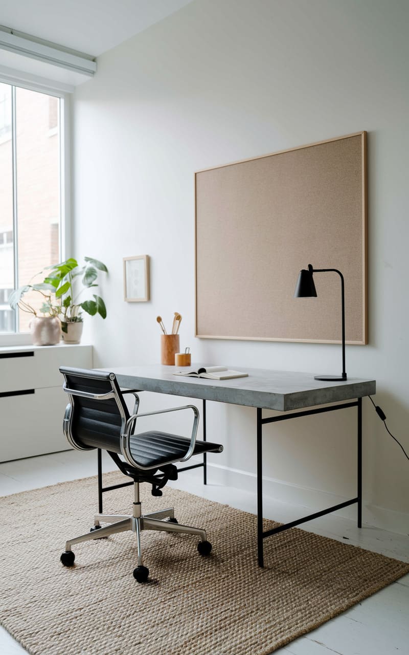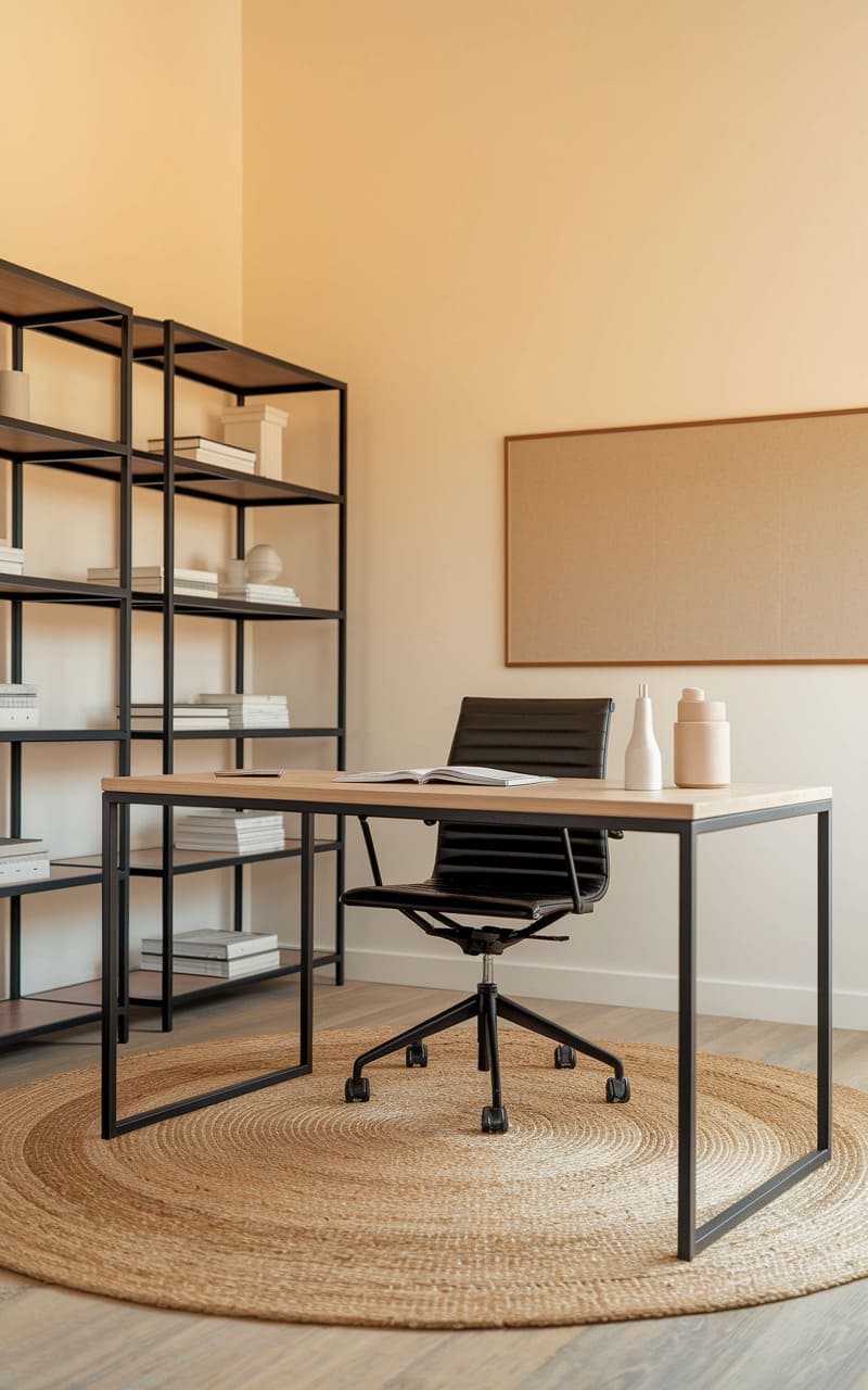 This space whispers of quiet focus, a haven carved from simplicity. A sleek, light wood desk floats above a woven circle, anchored by a modern chair, all against a backdrop of soft, creamy walls. A skeletal bookshelf, a study in black lines and open shelves, stands sentinel, while a framed corkboard waits patiently for inspiration. The room hums with potential, a blank canvas ready for the day’s work.
