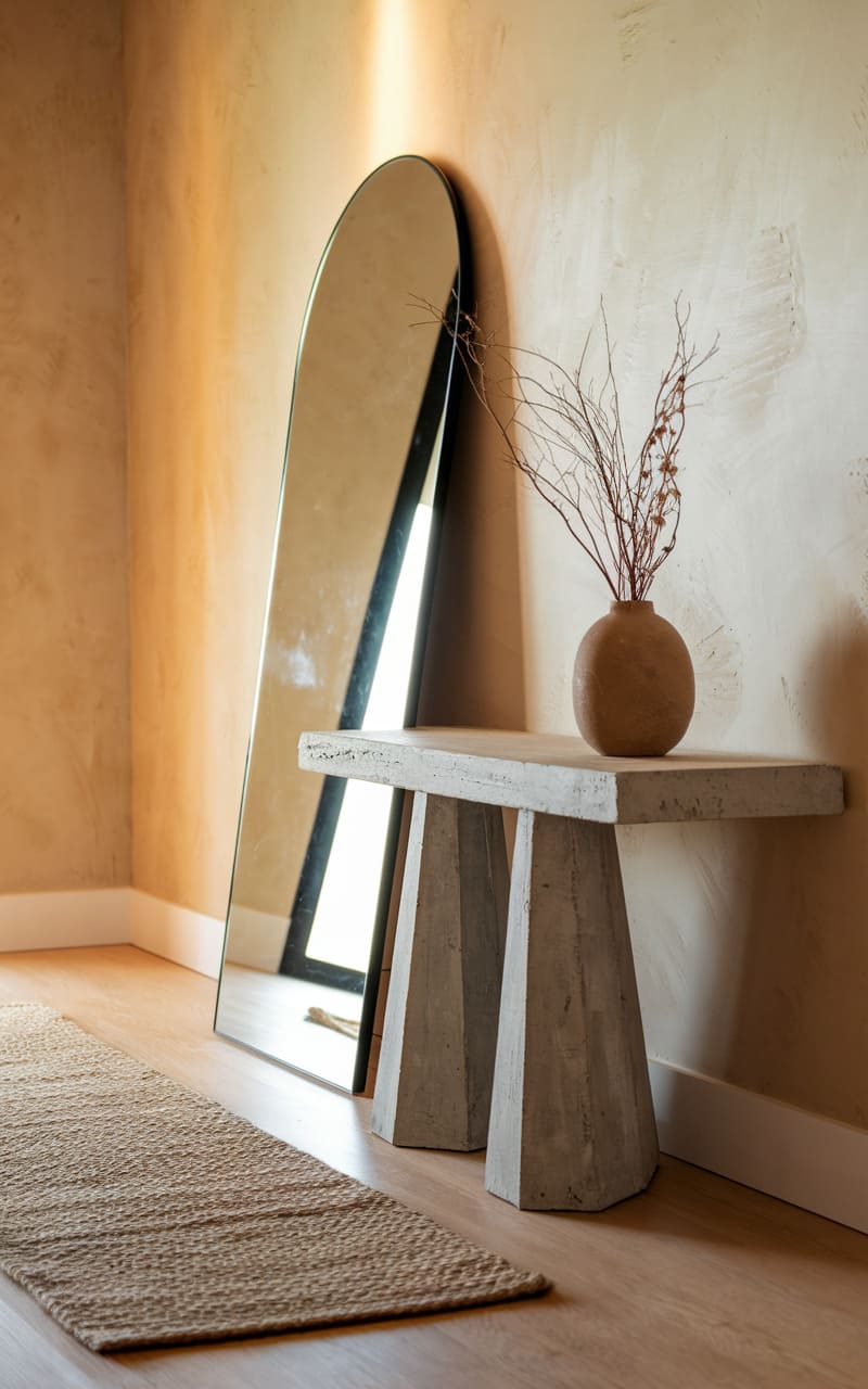 A whisper of warmth spills across textured walls, illuminating a sleek, arched mirror leaning casually against the corner. A chunky, concrete bench anchors the space, its geometric legs a stark contrast to the delicate, twiggy arrangement in a rounded vase. A woven rug stretches out, grounding the scene in organic texture, while the polished floor reflects the subtle glow, creating an intimate, almost monastic simplicity.