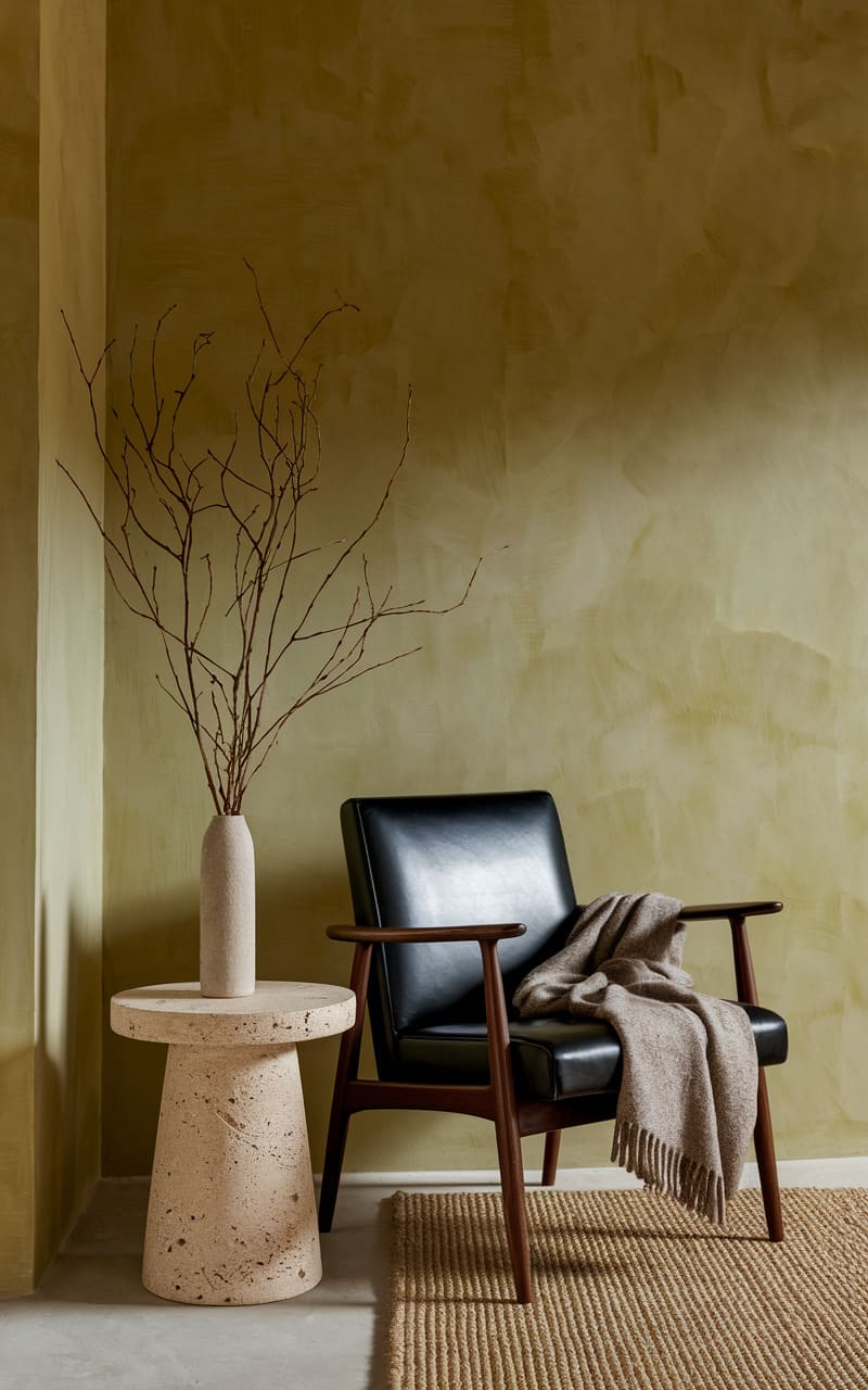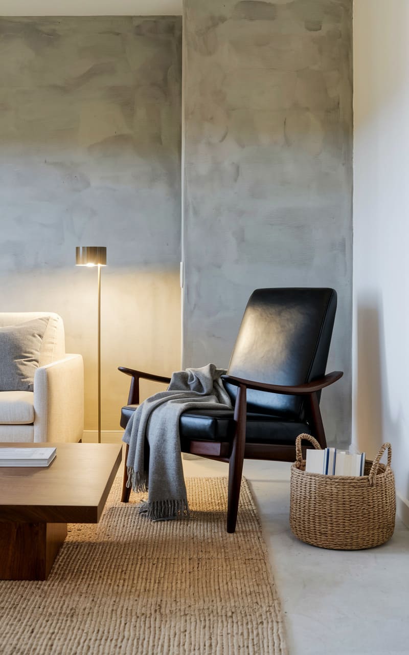 The room whispers a quiet elegance, where a charcoal leather armchair rests like a still shadow against walls textured with the ghost of a storm cloud. A woven basket sits patiently, holding striped secrets, while a soft throw spills across the chair’s arm, inviting a moment of repose. The light, cast by a slender brass lamp, highlights the raw beauty of the jute rug, a grounding element in this sanctuary of serene simplicity.