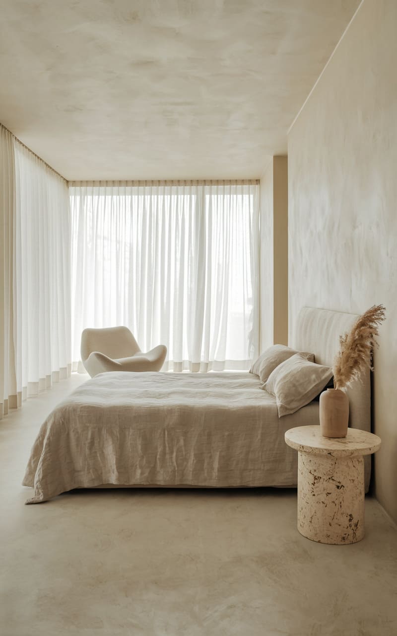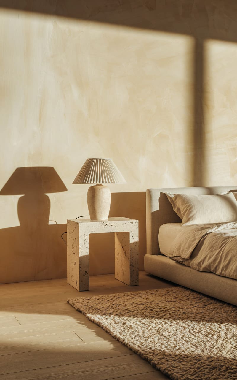 49. Minimalist Bedroom with a Travertine Nightstand