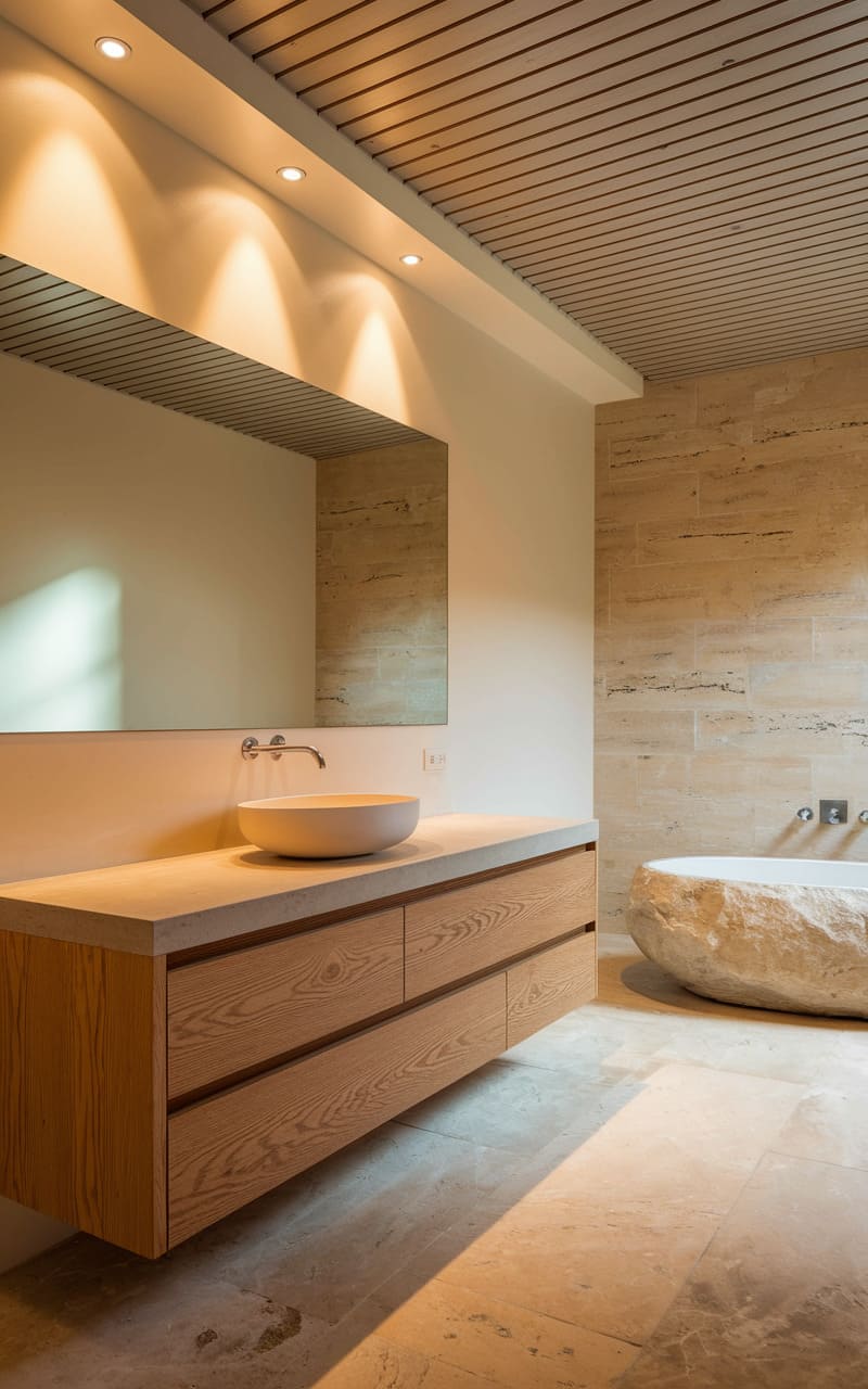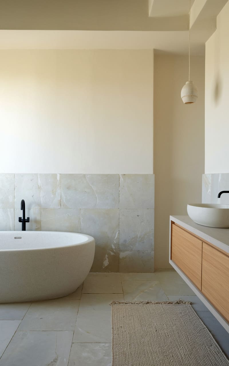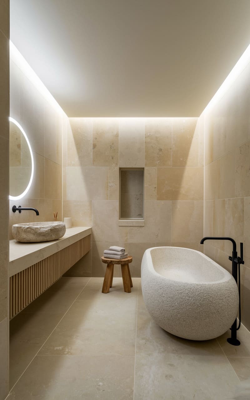 198. Minimalist Bathroom with Soft Ivory and Stone Textures