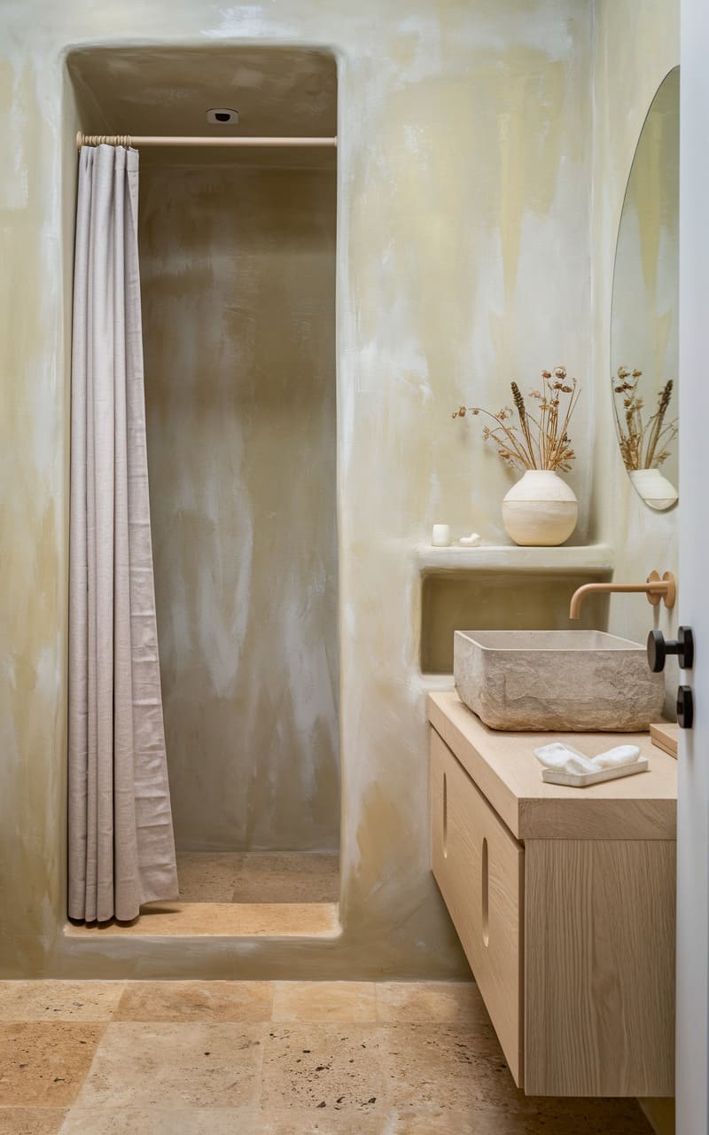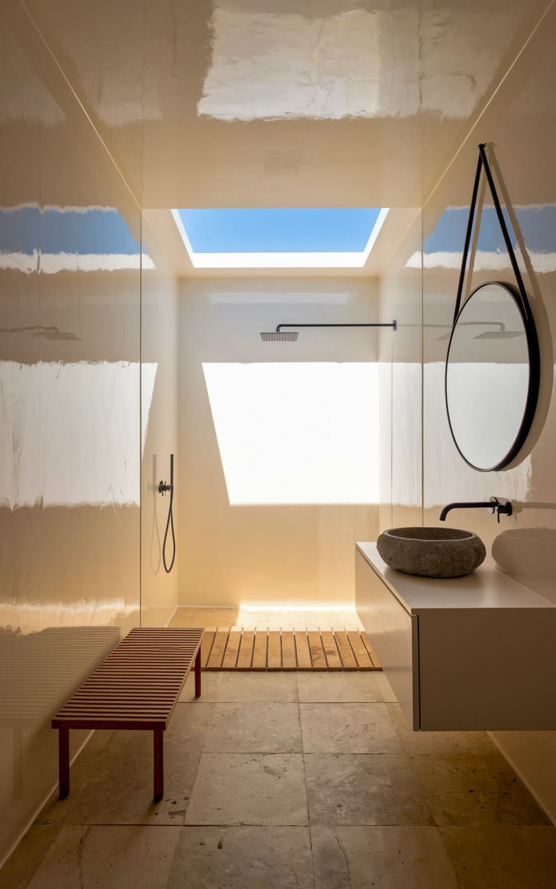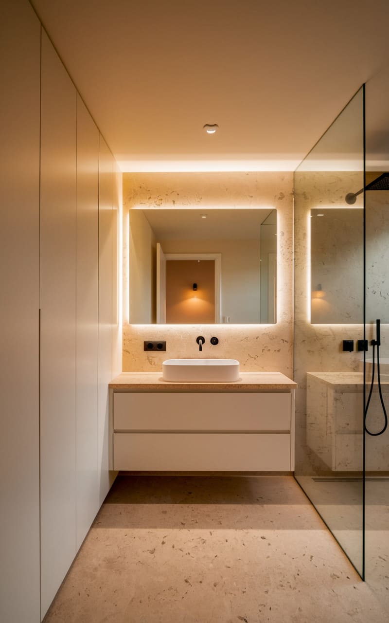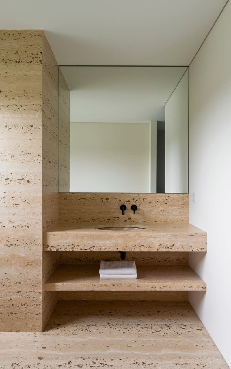 198. Minimalist Bathroom with Soft Ivory and Stone Textures