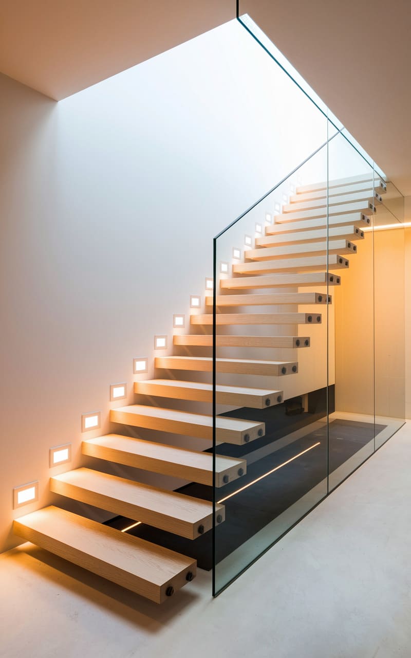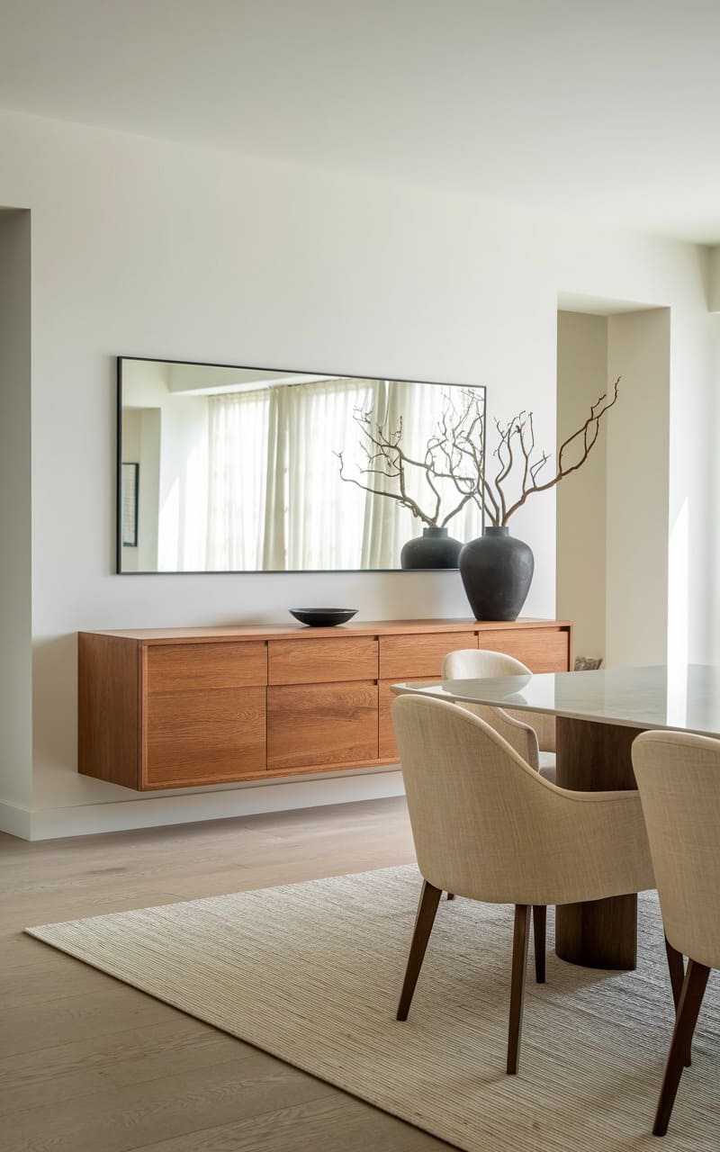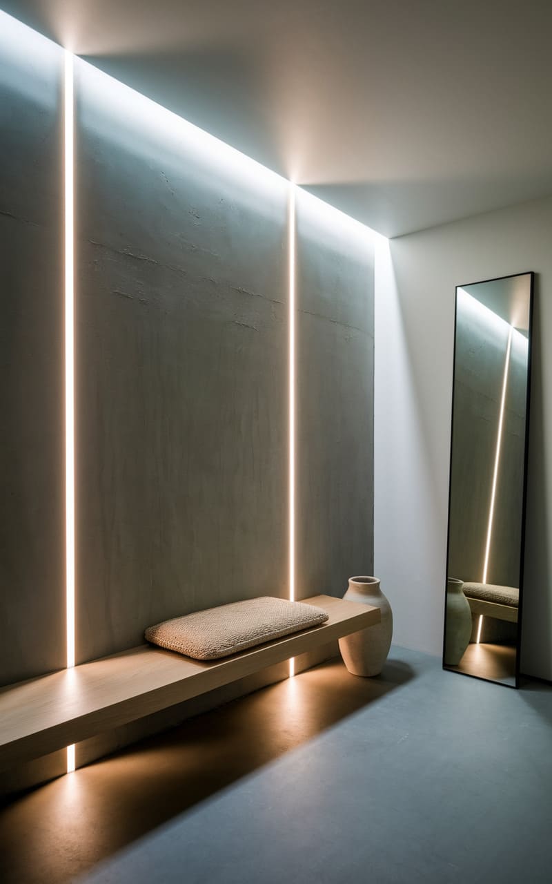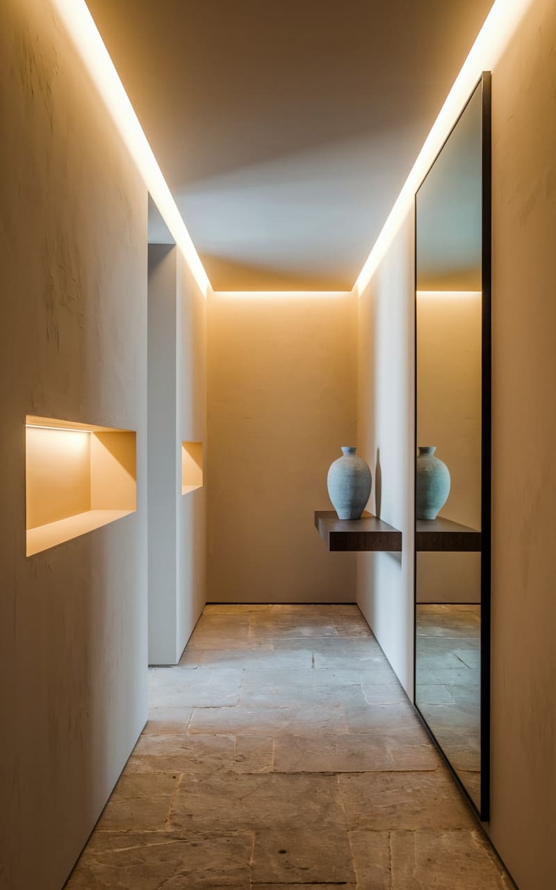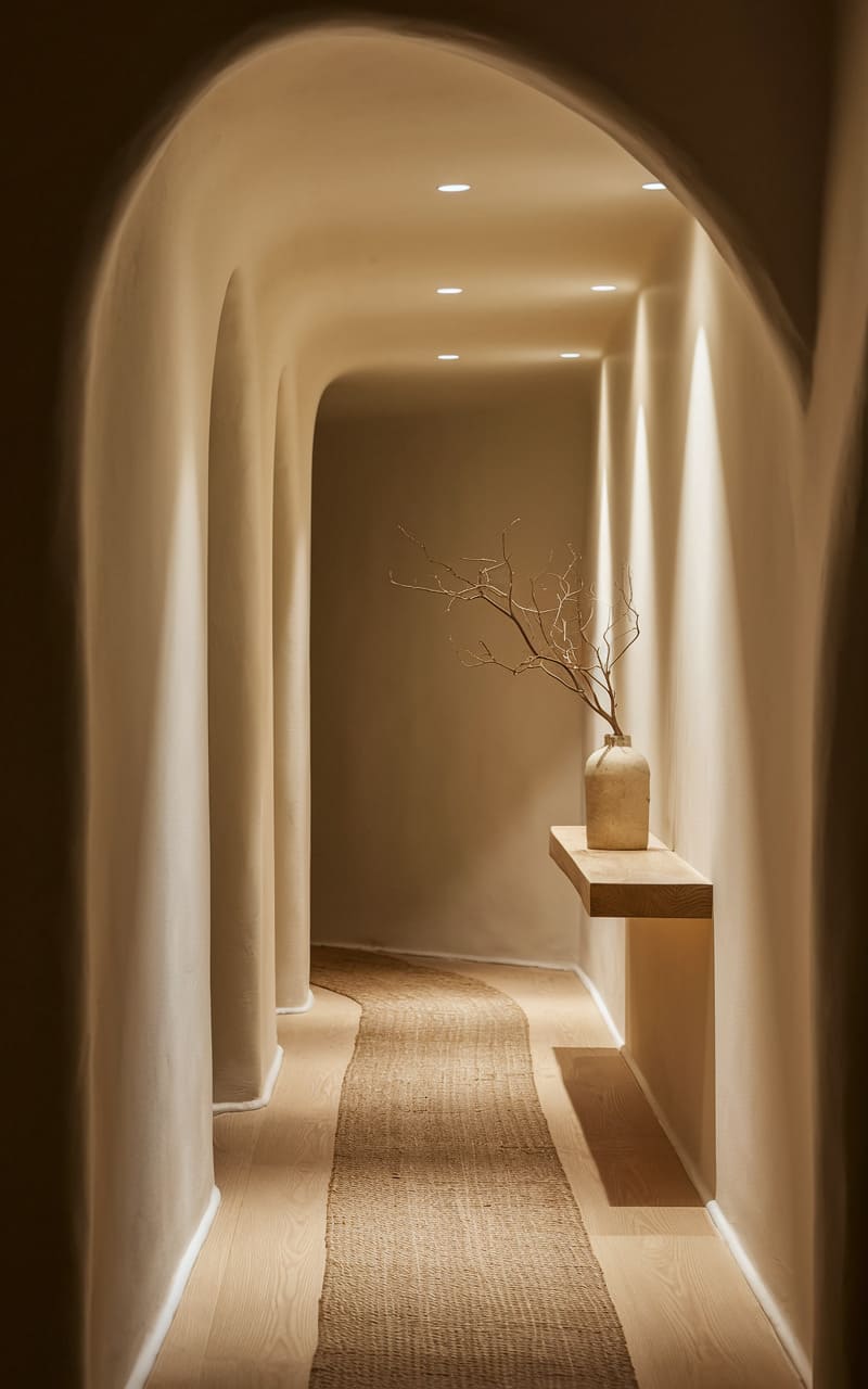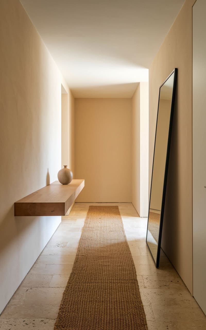 A whisper of serenity inhabits this space, where a floating oak bench invites a moment’s pause beneath a perfectly circular mirror. A textured runner stretches across the polished floor, guiding the eye towards the soft glow filtering through a distant window. The simple palette and clean lines speak of uncluttered living, a sanctuary carved from quiet elegance.