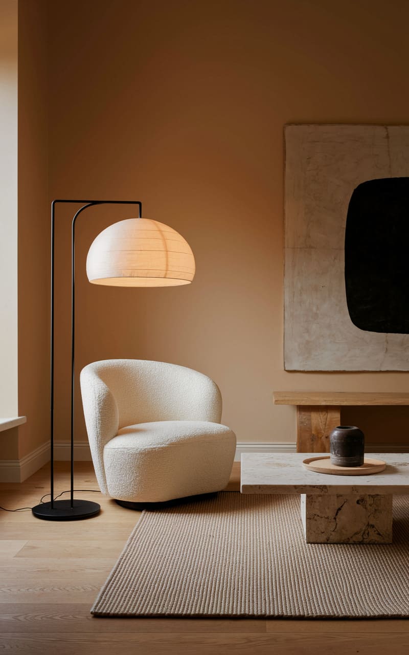 Whispers of warmth fill this serene space, where a plush, cloud-like armchair cradles a soft throw, beckoning you to unwind. A gentle glow emanates from a simple lamp, illuminating the textured fabric and casting a cozy ambiance across the room. The clean lines of a floor lamp and a low bookshelf add a touch of modern elegance, creating a tranquil haven for quiet contemplation.