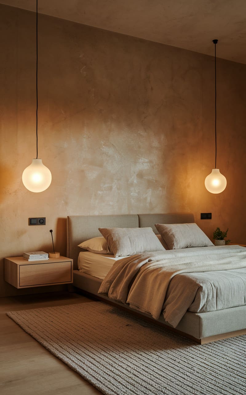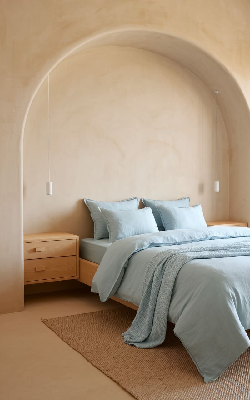 A serene, almost monastic bedroom nestles within a soft, arched alcove, where textured walls in warm, earthy tones embrace a low-slung bed dressed in cool, cloud-like linens. Twin pendant lights dangle like delicate earrings, casting a gentle glow upon the simple wooden nightstands and a woven rug that anchors the space. The room exudes a quiet, contemplative air, a haven of tactile tranquility.