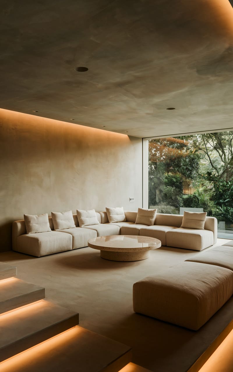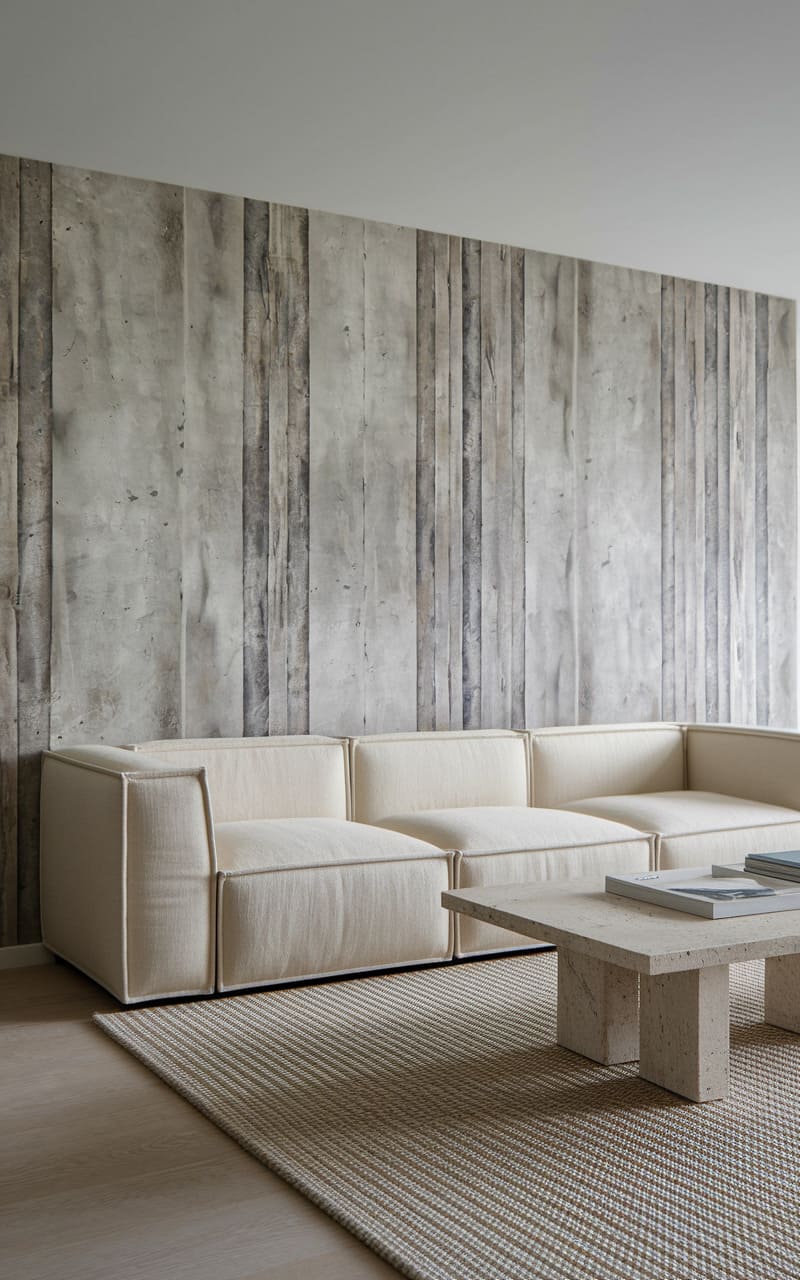 181. Minimalist Living Room with Soft Taupe and Subtle Geometric Patterns