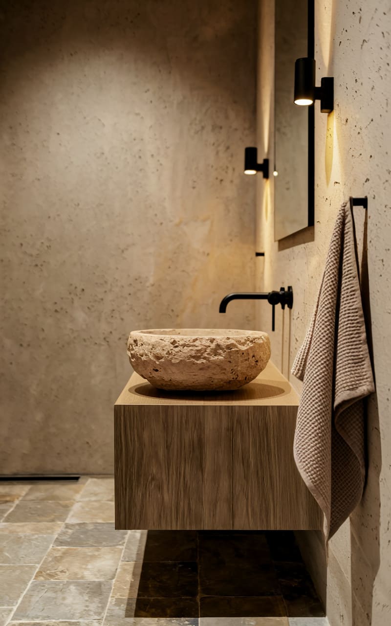 44. Minimalist Bathroom with a Stone Vessel Sink