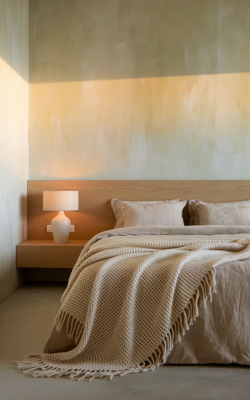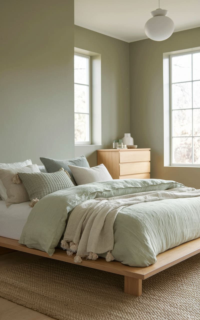 197. Minimalist Bedroom with Light Sage and Wooden Textures