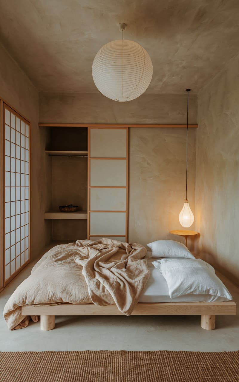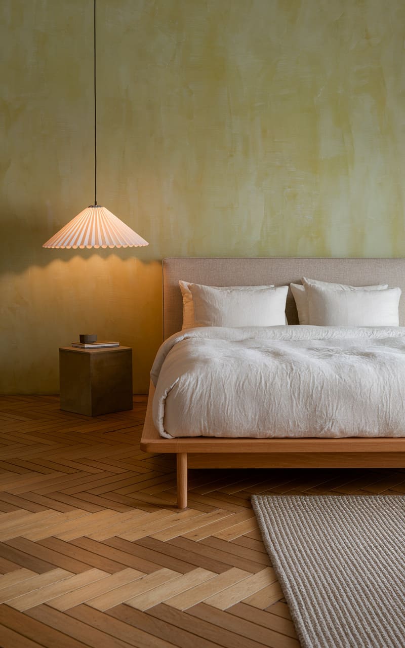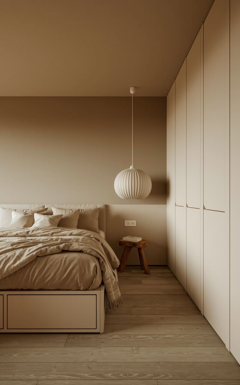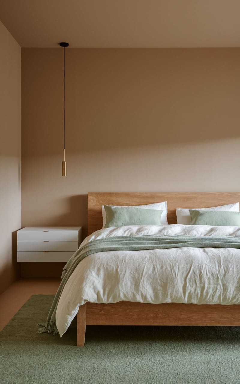 A warm, earthy palette envelops this serene bedroom, where walls whisper in shades of taupe and sand, creating a hushed, restful atmosphere. The low-slung wooden bed, draped in soft linens and mint-green accents, anchors the space with a quiet, organic charm. A single, slender pendant light descends like a golden thread, casting a gentle glow upon the simple, floating bedside table, adding a touch of understated elegance to this tranquil haven.