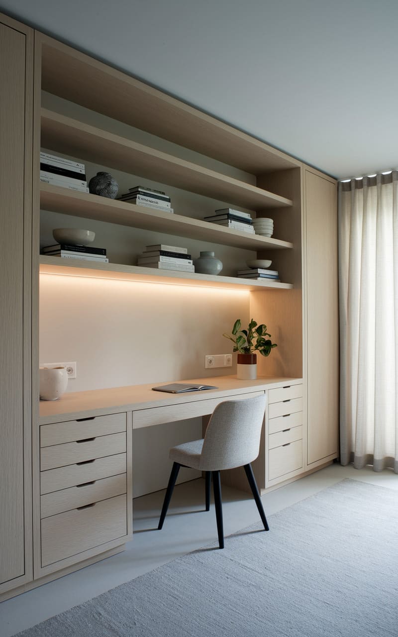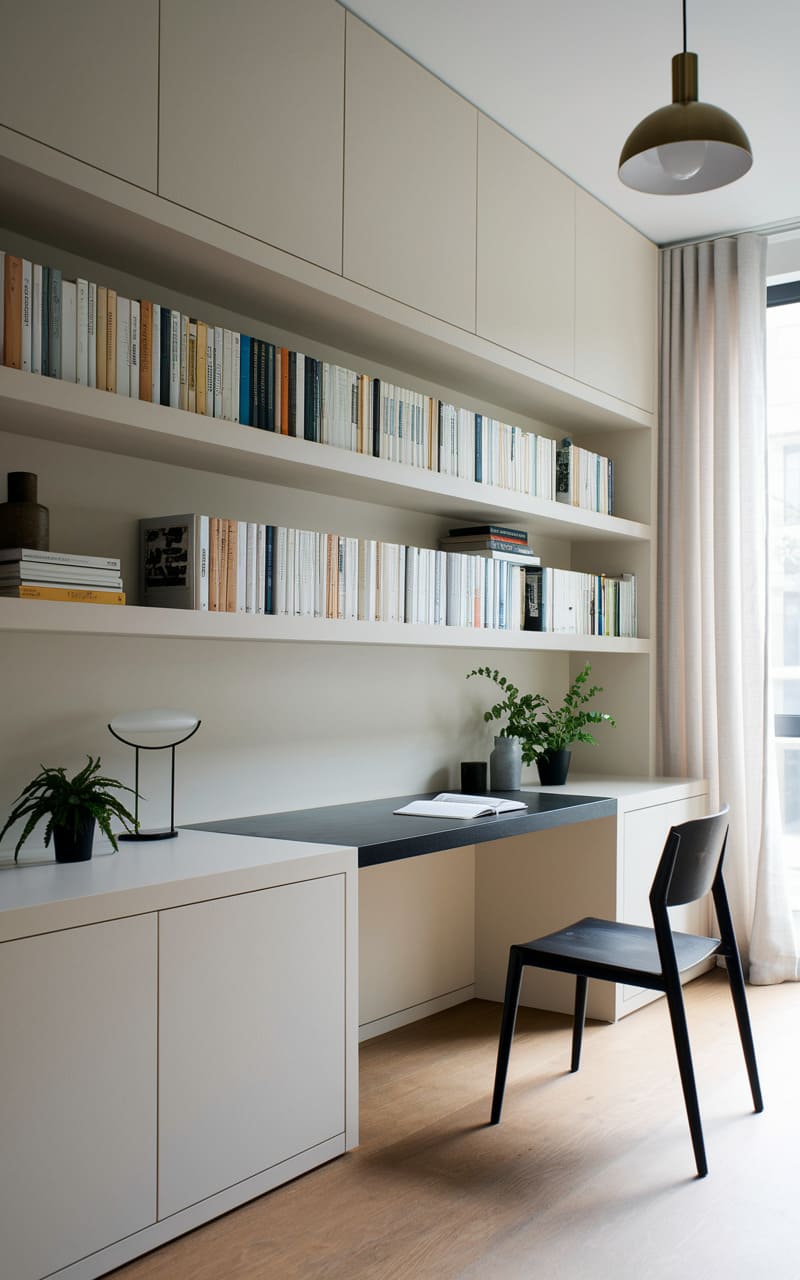 A haven of focused simplicity unfolds, where a slender desk juts out from a wall of seamless cabinetry, its dark surface a stark contrast to the pale wood and off-white tones. Floating shelves, laden with books, stretch across the wall, hinting at a life of quiet contemplation, while a solitary chair stands poised, ready for the next thought. A pendant light hangs suspended, a gentle beacon in the room, and gauzy curtains soften the edges of the outside world, creating a sanctuary for work and reflection.
