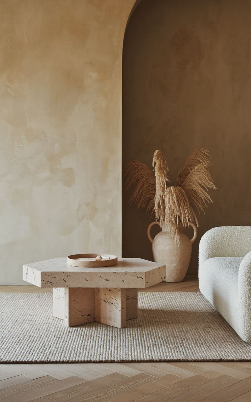 167. Minimalist Living Room with Warm Taupe and Terracotta Accents