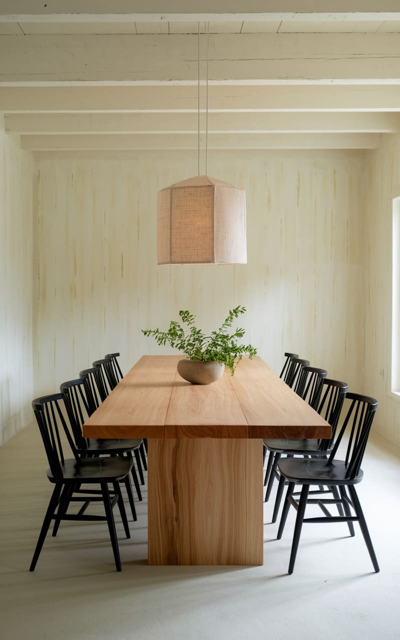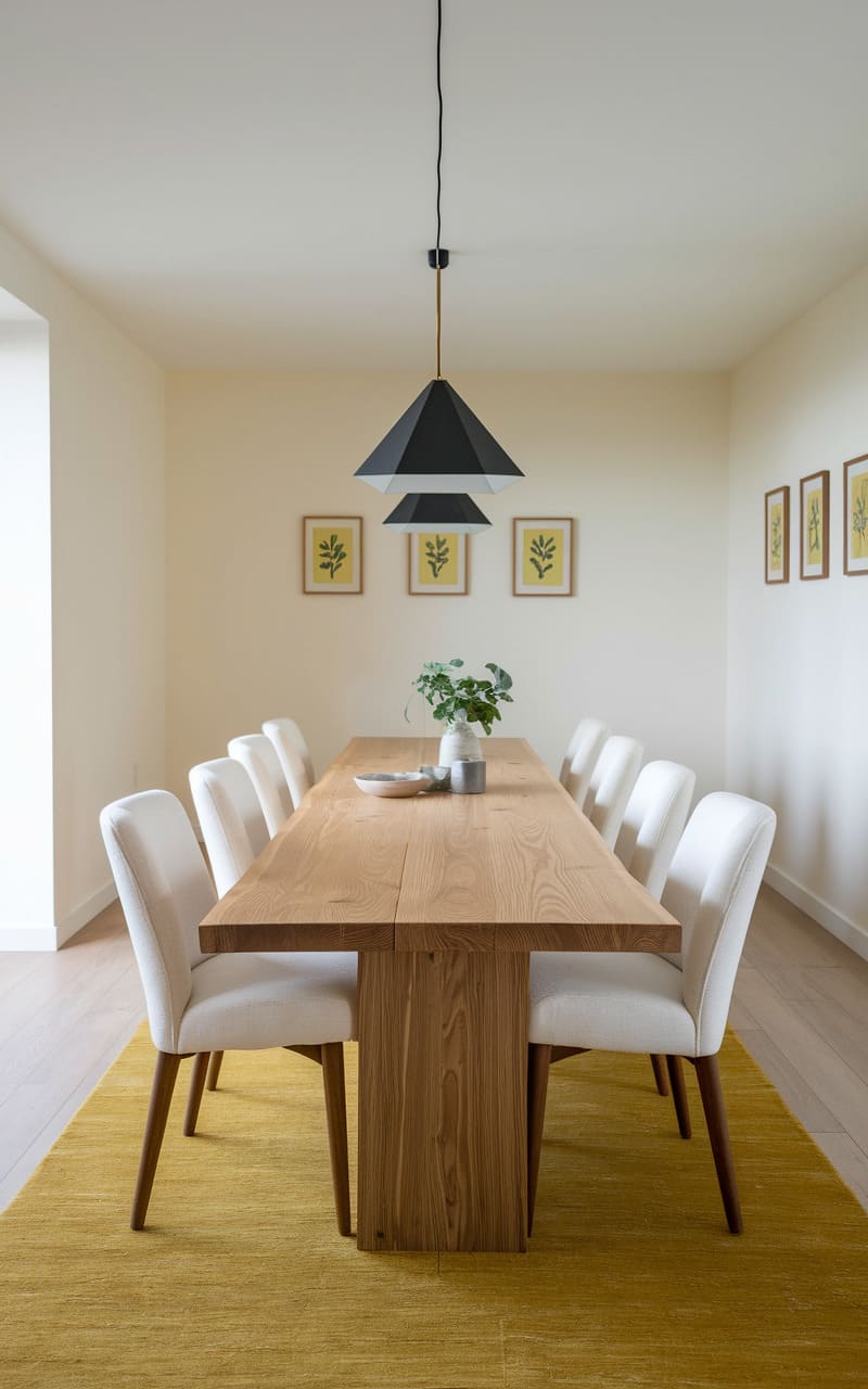 164. Minimalist Dining Room with Warm Wood and Soft Yellow Accents