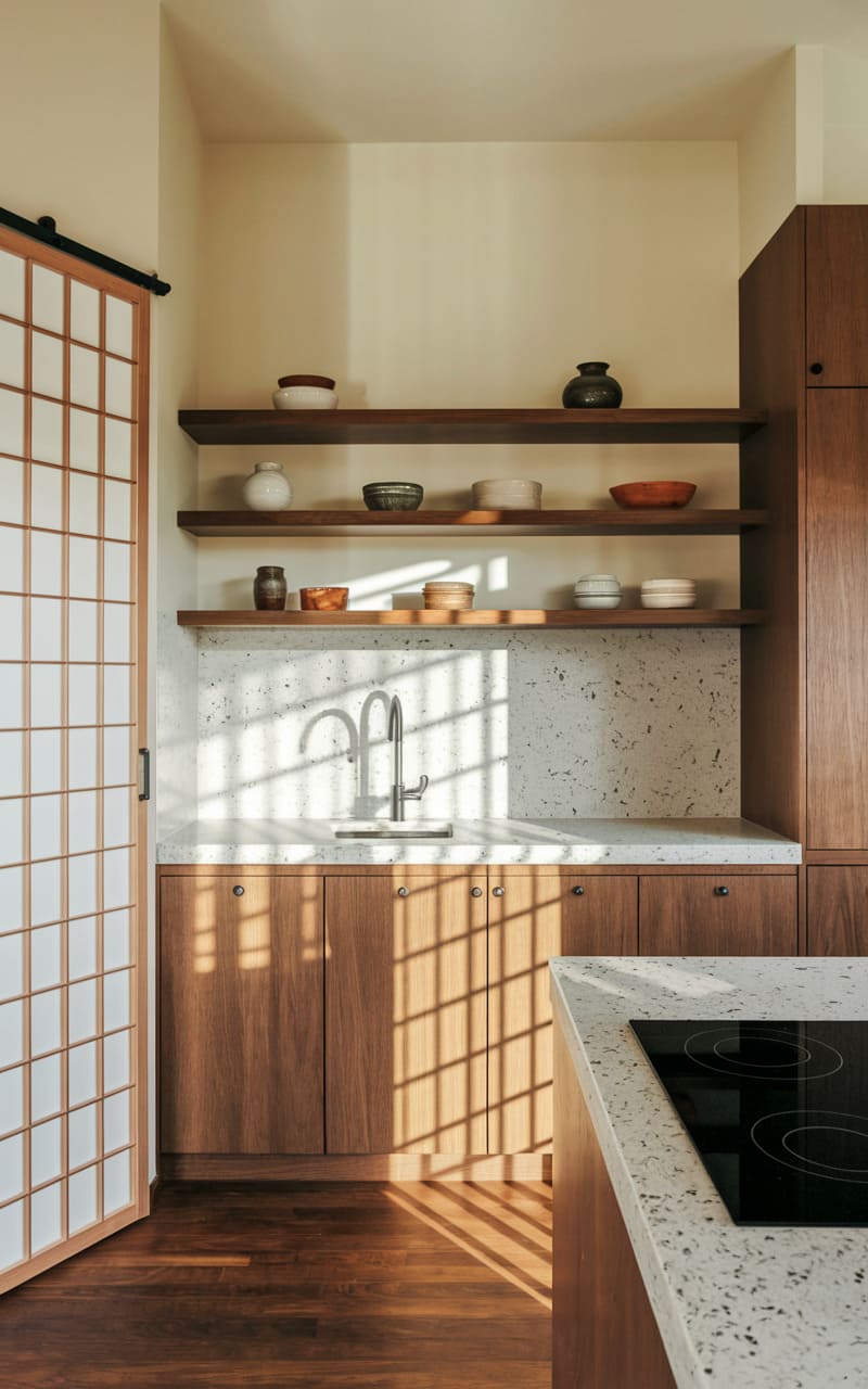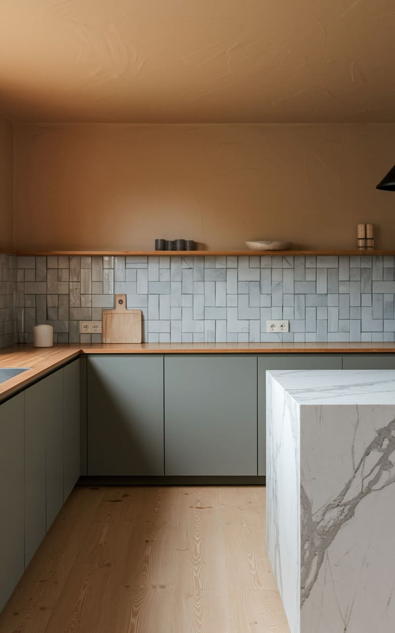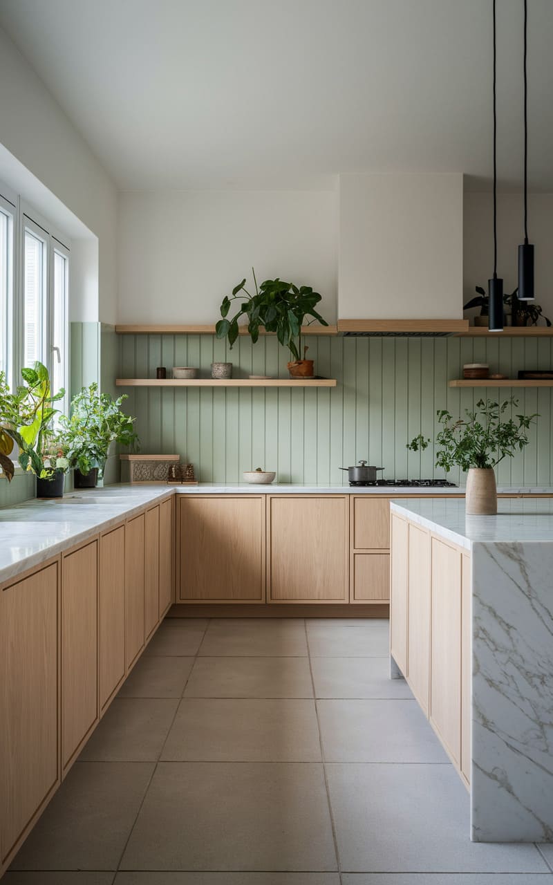 195. Minimalist Kitchen with Warm Wood and Soft Green Accents