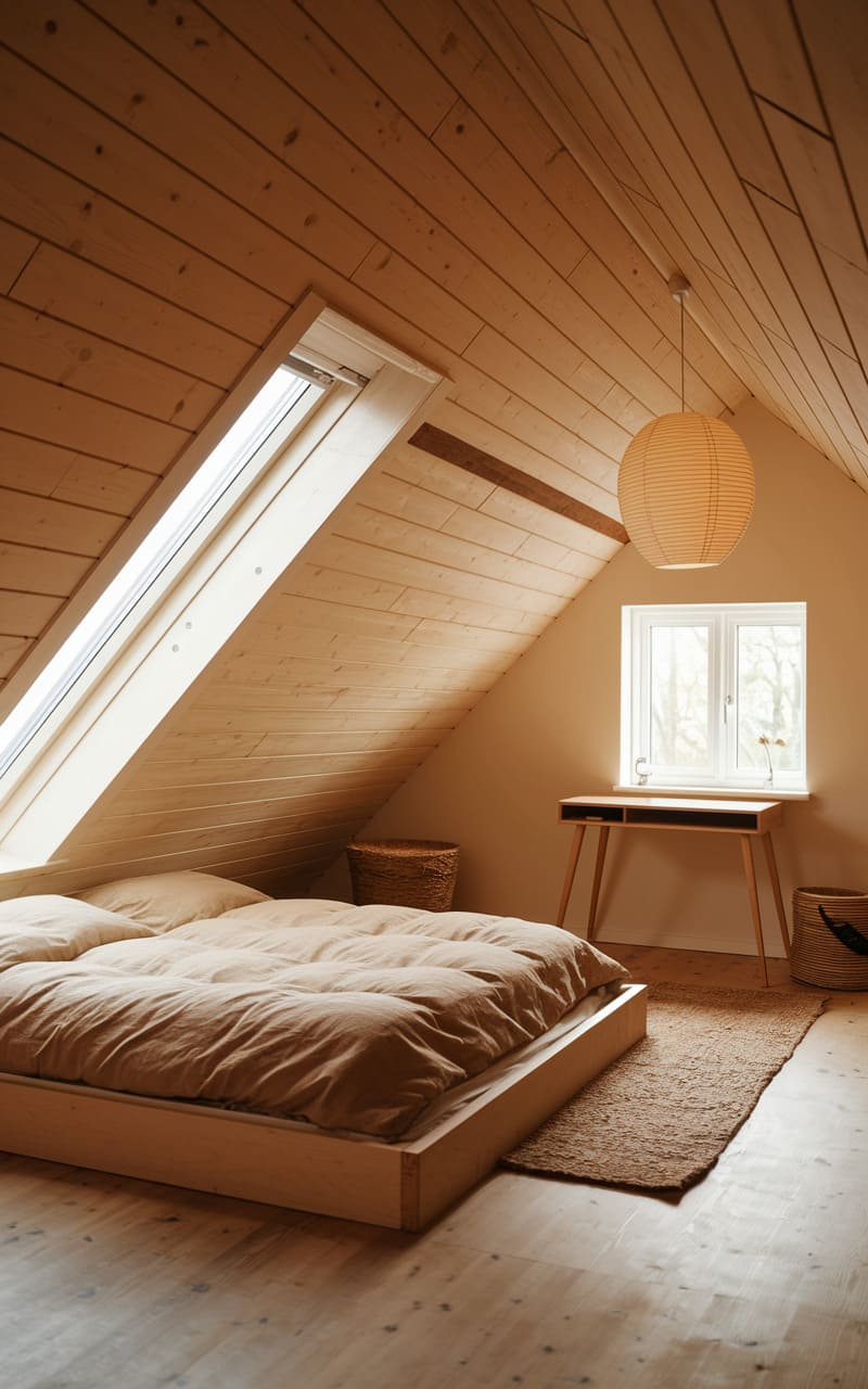 A cozy attic bedroom, clad in warm wood from sloped ceiling to floor, embraces a low platform bed draped in soft neutrals. A paper lantern casts a gentle glow, highlighting the simple lines of a small desk and the inviting textures of woven baskets tucked into corners. The space, a quiet retreat under the eaves, whispers of peaceful slumber and unhurried mornings.