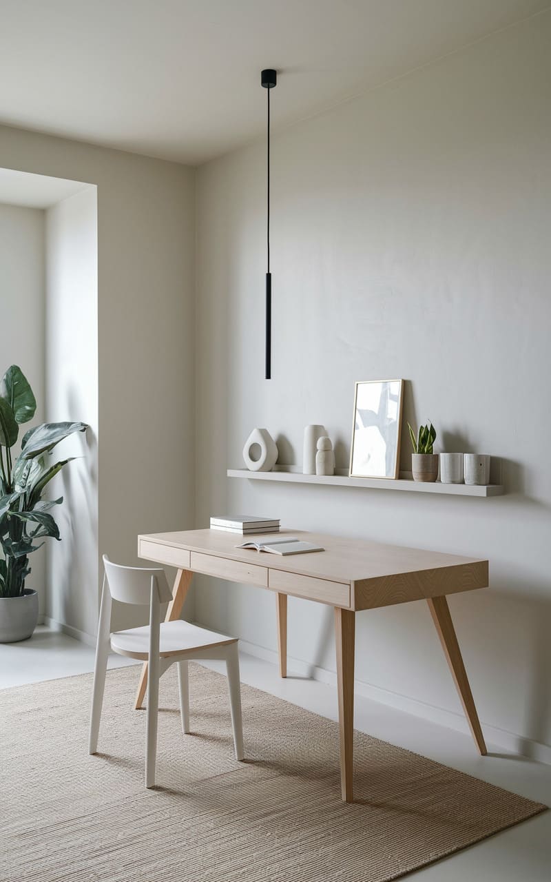 A study in Scandinavian simplicity, this workspace balances clean lines and natural textures with a light wood desk taking center stage, its tapered legs a subtle nod to mid-century design. A single, sleek pendant illuminates the scene, casting a gentle glow upon the neutral palette and a floating shelf adorned with curated objects, while a lush potted plant adds a touch of organic warmth to the airy, uncluttered space.