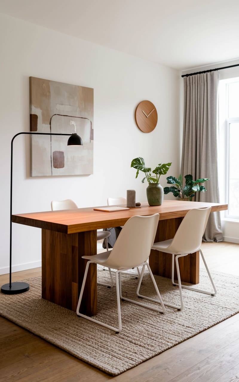 A gathering space unfolds with a robust wooden table at its heart, flanked by modern, skeletal chairs. A leaning floor lamp casts a focused glow, highlighting the abstract art on the wall, while a simple wooden clock echoes the table’s warmth. The room, grounded by a textured rug and softened by flowing drapes, exudes a quiet sophistication, a place for thoughtful conversation and shared meals.