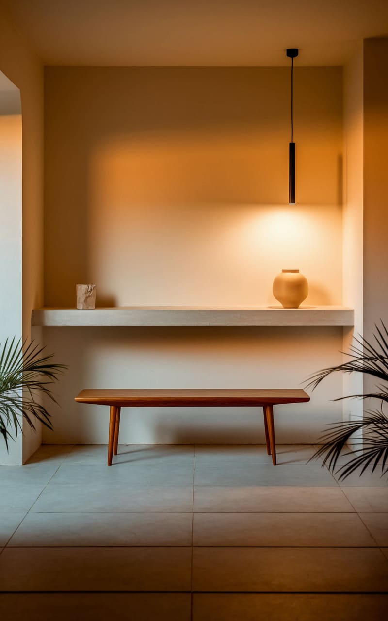 A warm, almost ethereal glow emanates from a single pendant light, spotlighting a simple arrangement: a smooth, wooden bench resting before a recessed shelf, its contents minimal – a small sculpture, a rounded vase. The space, defined by its clean lines and neutral palette, fosters a sense of quietude, with the suggestion of lush, palm-like plants adding a touch of organic life to the serene, almost monastic setting.