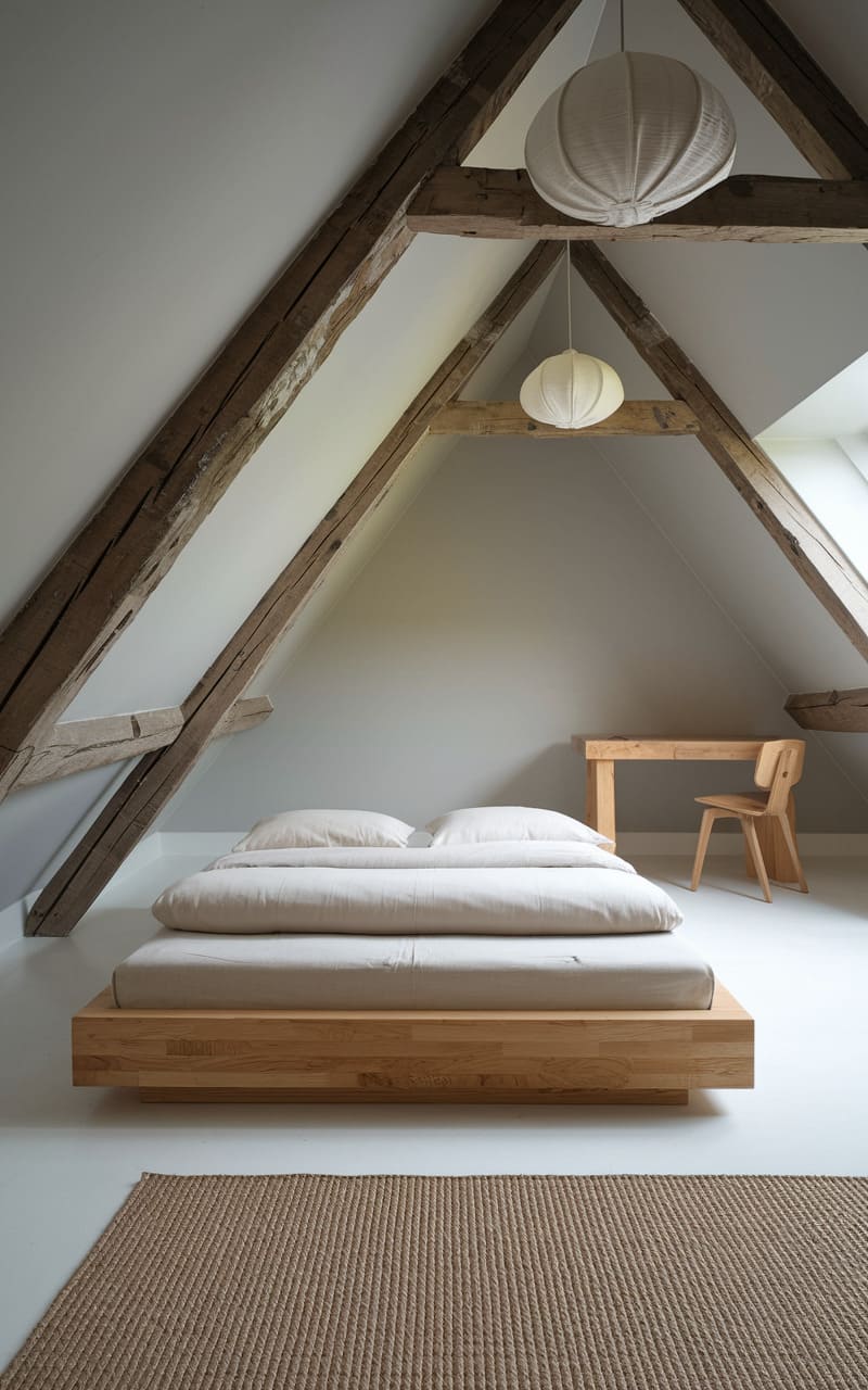 The skeletal frame of an attic space, with its exposed beams forming a dramatic ‘A’, cradles a low-profile platform bed, a simple wooden desk, and a solitary chair, hinting at a quiet, almost monastic retreat. Twin paper lanterns diffuse the room’s illumination, casting a soft, even glow that highlights the natural textures of the wood and woven rug, creating a serene haven beneath the sloping eaves.
