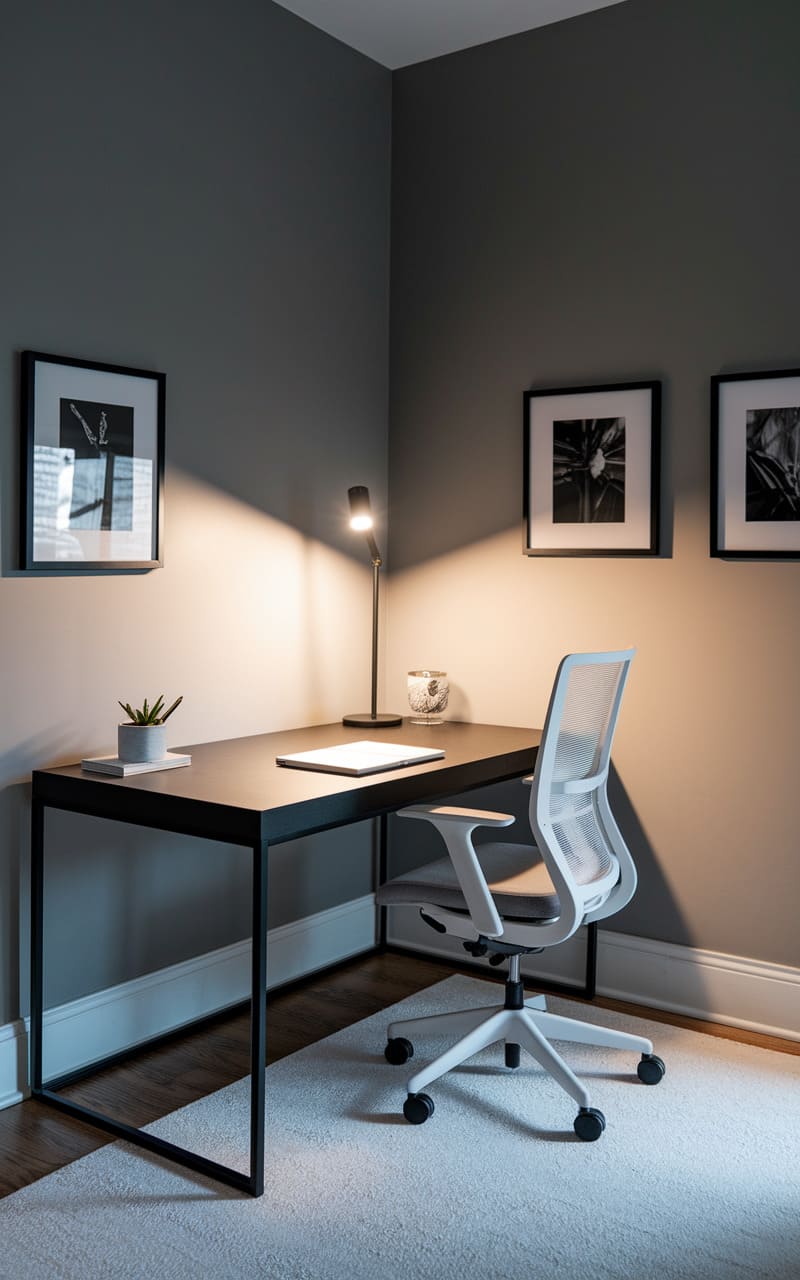 A hushed, contemplative air fills this corner office, where a sleek black desk anchors the space, its surface illuminated by a focused beam from a slender lamp. The minimalist aesthetic extends to the framed monochrome prints lining the muted gray walls, their stark imagery adding a touch of drama. A modern office chair, with its light mesh back, offers a stark contrast to the dark desk, while a soft rug underfoot provides a subtle textural counterpoint, creating a space that feels both functional and quietly sophisticated.