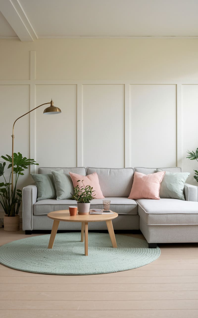 A gentle palette of soft grays and pastel accents breathes life into this uncluttered space. A plush, sectional sofa in a muted gray anchors the room, its clean lines softened by a scattering of blush and sage cushions. A round, light-wood coffee table sits atop a circular, mint-green rug, its gentle hue echoing the surrounding greenery. A slender, brass-toned floor lamp arches gracefully over the scene, casting a warm, diffused glow that highlights the subtle paneling on the wall behind the sofa, creating a sense of calm and understated elegance.