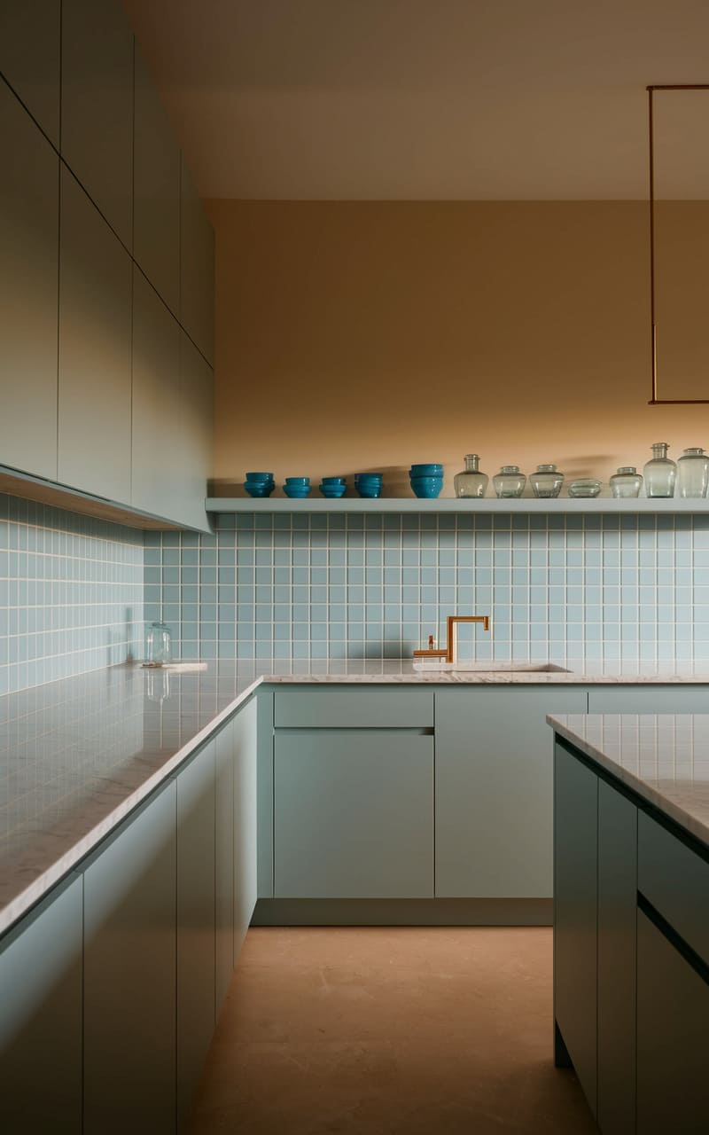The room breathes a cool, pastel serenity, its muted mint cabinetry stretching into the distance like a tranquil horizon. A slender shelf, adorned with a parade of delicate glass and ceramic vessels, traces a line against the warm, earthy backdrop. The sleek countertop reflects a soft, diffused glow, suggesting a space designed for quiet contemplation rather than bustling activity. A slender, copper faucet stands as a focal point, its warm hue echoing the wall behind, a subtle spark of life in the otherwise hushed, almost dreamlike atmosphere.