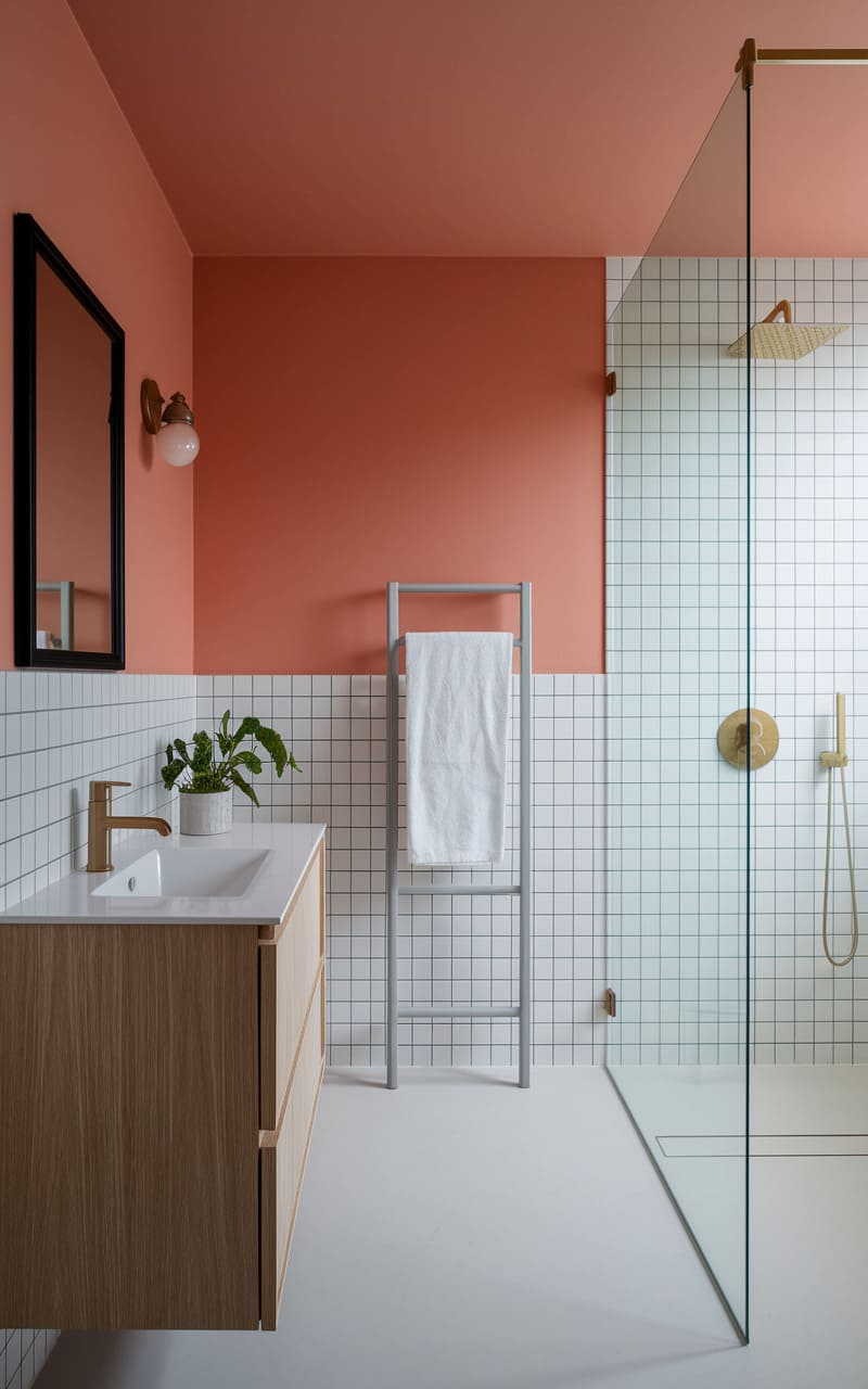 A whisper of coral embraces the upper reaches of this minimalist bathroom, contrasting sharply with the crisp grid of white tiles that climb the walls. A natural wood vanity anchors the space, its clean lines mirrored in the slender towel ladder, while brass accents gleam, adding a touch of warmth to the cool, contemporary aesthetic. The frameless glass shower, a transparent boundary, hints at a refreshing escape, completing this haven of understated elegance.