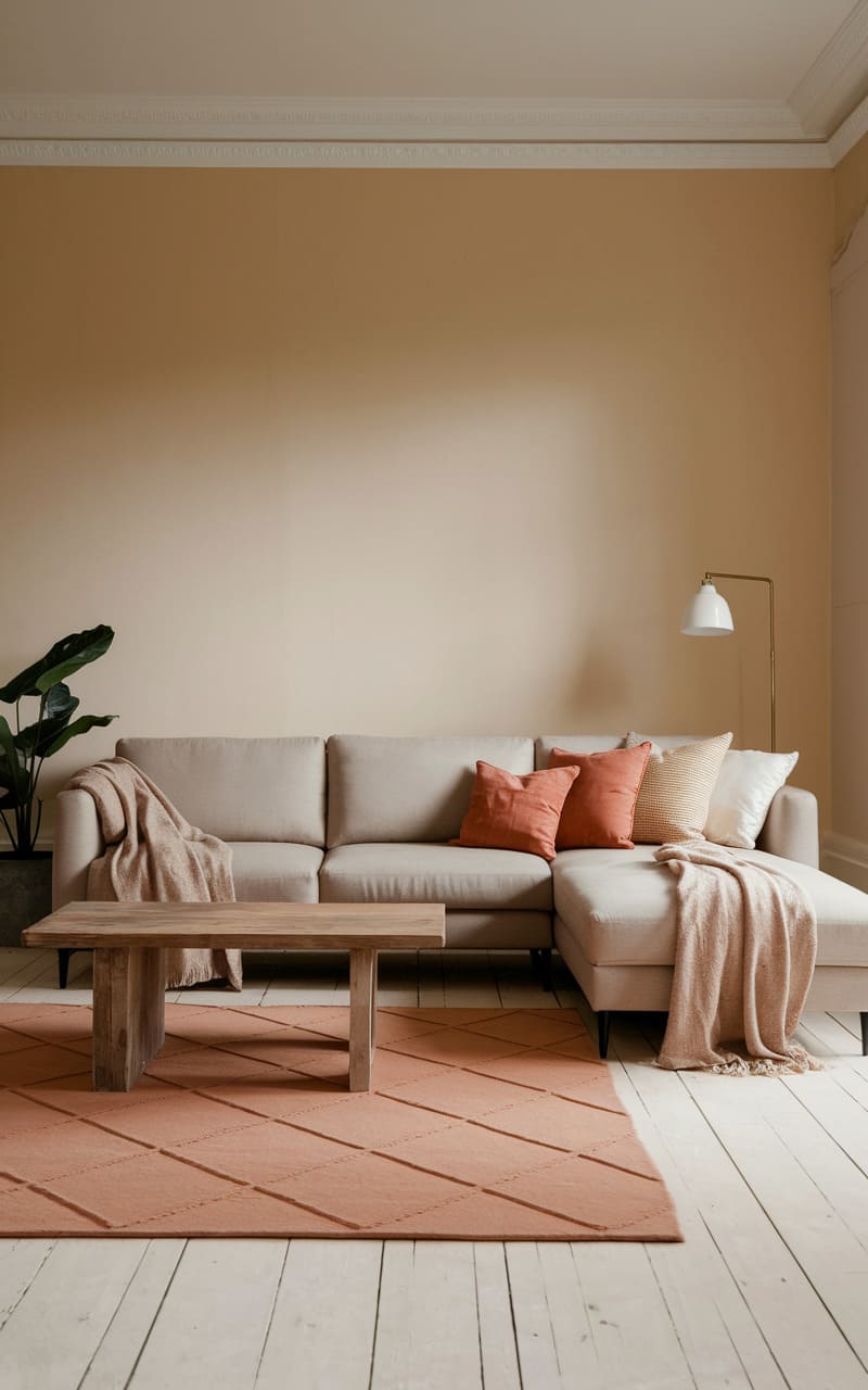 A soft, almost edible, palette of apricot and cream fills this living space, where a plush sectional invites lounging against a backdrop of warm, matte walls. A simple wooden coffee table anchors the arrangement, while a textured rug adds a subtle geometric touch underfoot. A lone floor lamp stands sentinel, ready to cast a gentle glow, and a leafy plant adds a touch of organic life to the serene, uncluttered scene.